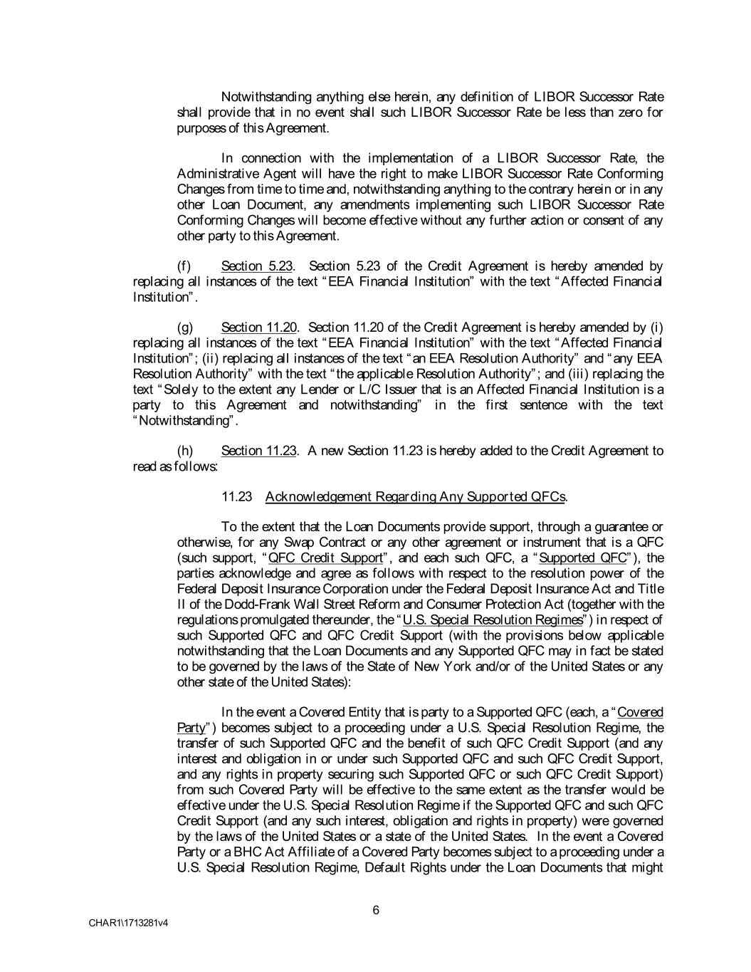 Notwithstanding anything else herein, any definition of LIBOR Successor Rate shall provide that in no event shall such LIBOR Successor Rate be less than zero for purposes of this Agreement. In connection with the implementation of a LIBOR Successor Rate, the Administrative Agent will have the right to make LIBOR Successor Rate Conforming Changes from time to time and, notwithstanding anything to the contrary herein or in any other Loan Document, any amendments implementing such LIBOR Successor Rate Conforming Changes will become effective without any further action or consent of any other party to this Agreement. (f) Section 5.23. Section 5.23 of the Credit Agreement is hereby amended by replacing all instances of the text “EEA Financial Institution” with the text “Affected Financial Institution”. (g) Section 11.20. Section 11.20 of the Credit Agreement is hereby amended by (i) replacing all instances of the text “EEA Financial Institution” with the text “Affected Financial Institution”; (ii) replacing all instances of the text “an EEA Resolution Authority” and “any EEA Resolution Authority” with the text “the applicable Resolution Authority”; and (iii) replacing the text “Solely to the extent any Lender or L/C Issuer that is an Affected Financial Institution is a party to this Agreement and notwithstanding” in the first sentence with the text “Notwithstanding”. (h) Section 11.23. A new Section 11.23 is hereby added to the Credit Agreement to read as follows: 11.23 Acknowledgement Regarding Any Supported QFCs. To the extent that the Loan Documents provide support, through a guarantee or otherwise, for any Swap Contract or any other agreement or instrument that is a QFC (such support, “QFC Credit Support”, and each such QFC, a “Supported QFC”), the parties acknowledge and agree as follows with respect to the resolution power of the Federal Deposit Insurance Corporation under the Federal Deposit Insurance Act and Title II of the Dodd-Frank Wall Street Reform and Consumer Protection Act (together with the regulations promulgated thereunder, the “U.S. Special Resolution Regimes”) in respect of such Supported QFC and QFC Credit Support (with the provisions below applicable notwithstanding that the Loan Documents and any Supported QFC may in fact be stated to be governed by the laws of the State of New York and/or of the United States or any other state of the United States): In the event a Covered Entity that is party to a Supported QFC (each, a “Covered Party”) becomes subject to a proceeding under a U.S. Special Resolution Regime, the transfer of such Supported QFC and the benefit of such QFC Credit Support (and any interest and obligation in or under such Supported QFC and such QFC Credit Support, and any rights in property securing such Supported QFC or such QFC Credit Support) from such Covered Party will be effective to the same extent as the transfer would be effective under the U.S. Special Resolution Regime if the Supported QFC and such QFC Credit Support (and any such interest, obligation and rights in property) were governed by the laws of the United States or a state of the United States. In the event a Covered Party or a BHC Act Affiliate of a Covered Party becomes subject to a proceeding under a U.S. Special Resolution Regime, Default Rights under the Loan Documents that might 6 CHAR1\1713281v4