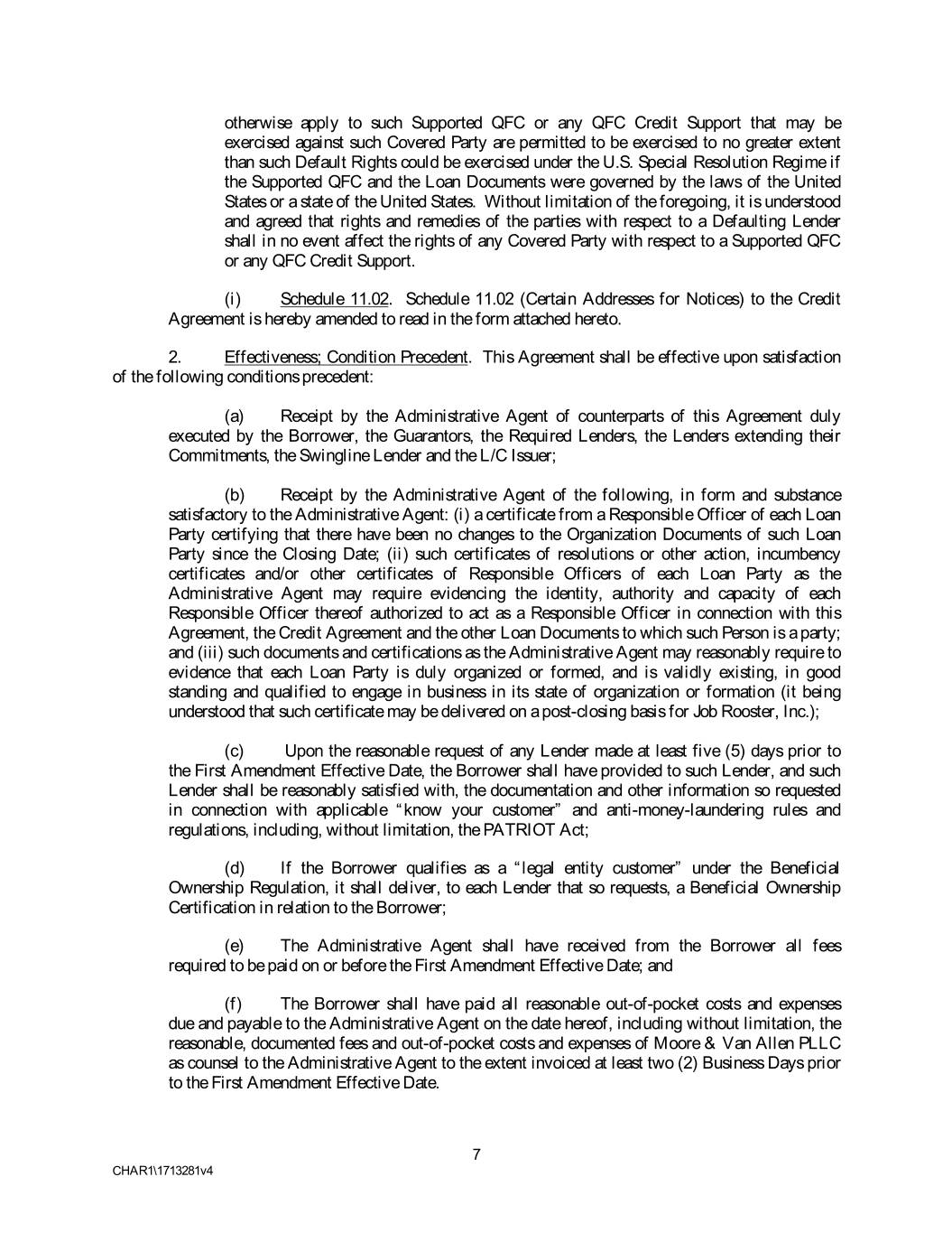 otherwise apply to such Supported QFC or any QFC Credit Support that may be exercised against such Covered Party are permitted to be exercised to no greater extent than such Default Rights could be exercised under the U.S. Special Resolution Regime if the Supported QFC and the Loan Documents were governed by the laws of the United States or a state of the United States. Without limitation of the foregoing, it is understood and agreed that rights and remedies of the parties with respect to a Defaulting Lender shall in no event affect the rights of any Covered Party with respect to a Supported QFC or any QFC Credit Support. (i) Schedule 11.02. Schedule 11.02 (Certain Addresses for Notices) to the Credit Agreement is hereby amended to read in the form attached hereto. 2. Effectiveness; Condition Precedent. This Agreement shall be effective upon satisfaction of the following conditions precedent: (a) Receipt by the Administrative Agent of counterparts of this Agreement duly executed by the Borrower, the Guarantors, the Required Lenders, the Lenders extending their Commitments, the Swingline Lender and the L/C Issuer; (b) Receipt by the Administrative Agent of the following, in form and substance satisfactory to the Administrative Agent: (i) a certificate from a Responsible Officer of each Loan Party certifying that there have been no changes to the Organization Documents of such Loan Party since the Closing Date; (ii) such certificates of resolutions or other action, incumbency certificates and/or other certificates of Responsible Officers of each Loan Party as the Administrative Agent may require evidencing the identity, authority and capacity of each Responsible Officer thereof authorized to act as a Responsible Officer in connection with this Agreement, the Credit Agreement and the other Loan Documents to which such Person is a party; and (iii) such documents and certifications as the Administrative Agent may reasonably require to evidence that each Loan Party is duly organized or formed, and is validly existing, in good standing and qualified to engage in business in its state of organization or formation (it being understood that such certificate may be delivered on a post-closing basis for Job Rooster, Inc.); (c) Upon the reasonable request of any Lender made at least five (5) days prior to the First Amendment Effective Date, the Borrower shall have provided to such Lender, and such Lender shall be reasonably satisfied with, the documentation and other information so requested in connection with applicable “know your customer” and anti-money-laundering rules and regulations, including, without limitation, the PATRIOT Act; (d) If the Borrower qualifies as a “legal entity customer” under the Beneficial Ownership Regulation, it shall deliver, to each Lender that so requests, a Beneficial Ownership Certification in relation to the Borrower; (e) The Administrative Agent shall have received from the Borrower all fees required to be paid on or before the First Amendment Effective Date; and (f) The Borrower shall have paid all reasonable out-of-pocket costs and expenses due and payable to the Administrative Agent on the date hereof, including without limitation, the reasonable, documented fees and out-of-pocket costs and expenses of Moore & Van Allen PLLC as counsel to the Administrative Agent to the extent invoiced at least two (2) Business Days prior to the First Amendment Effective Date. 7 CHAR1\1713281v4