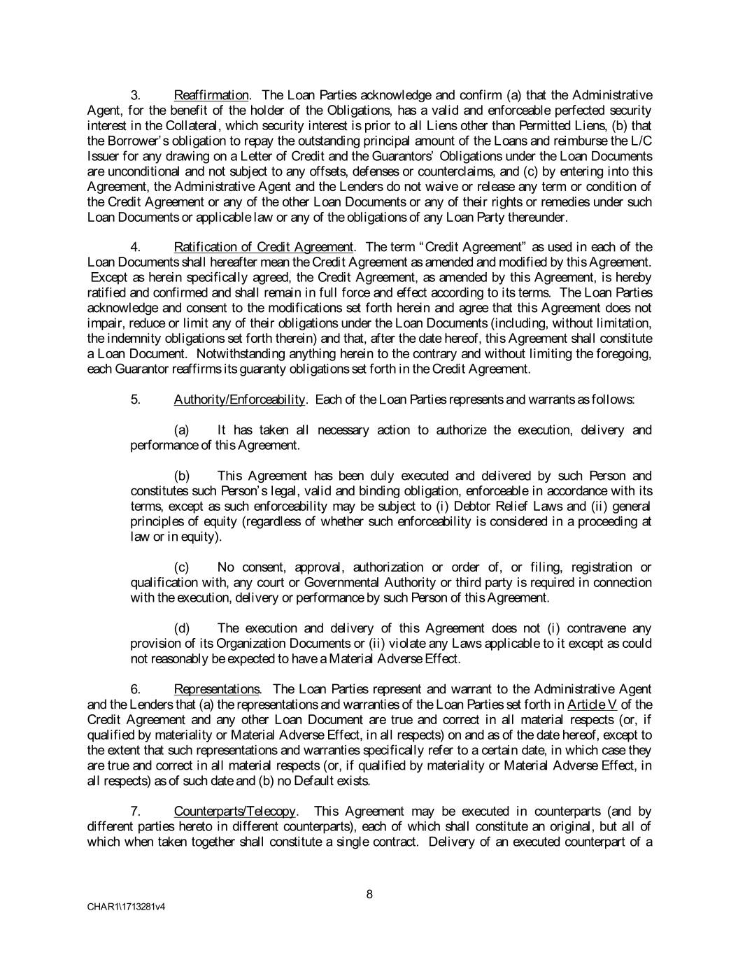 3. Reaffirmation. The Loan Parties acknowledge and confirm (a) that the Administrative Agent, for the benefit of the holder of the Obligations, has a valid and enforceable perfected security interest in the Collateral, which security interest is prior to all Liens other than Permitted Liens, (b) that the Borrower’s obligation to repay the outstanding principal amount of the Loans and reimburse the L/C Issuer for any drawing on a Letter of Credit and the Guarantors’ Obligations under the Loan Documents are unconditional and not subject to any offsets, defenses or counterclaims, and (c) by entering into this Agreement, the Administrative Agent and the Lenders do not waive or release any term or condition of the Credit Agreement or any of the other Loan Documents or any of their rights or remedies under such Loan Documents or applicable law or any of the obligations of any Loan Party thereunder. 4. Ratification of Credit Agreement. The term “Credit Agreement” as used in each of the Loan Documents shall hereafter mean the Credit Agreement as amended and modified by this Agreement. Except as herein specifically agreed, the Credit Agreement, as amended by this Agreement, is hereby ratified and confirmed and shall remain in full force and effect according to its terms. The Loan Parties acknowledge and consent to the modifications set forth herein and agree that this Agreement does not impair, reduce or limit any of their obligations under the Loan Documents (including, without limitation, the indemnity obligations set forth therein) and that, after the date hereof, this Agreement shall constitute a Loan Document. Notwithstanding anything herein to the contrary and without limiting the foregoing, each Guarantor reaffirms its guaranty obligations set forth in the Credit Agreement. 5. Authority/Enforceability. Each of the Loan Parties represents and warrants as follows: (a) It has taken all necessary action to authorize the execution, delivery and performance of this Agreement. (b) This Agreement has been duly executed and delivered by such Person and constitutes such Person’s legal, valid and binding obligation, enforceable in accordance with its terms, except as such enforceability may be subject to (i) Debtor Relief Laws and (ii) general principles of equity (regardless of whether such enforceability is considered in a proceeding at law or in equity). (c) No consent, approval, authorization or order of, or filing, registration or qualification with, any court or Governmental Authority or third party is required in connection with the execution, delivery or performance by such Person of this Agreement. (d) The execution and delivery of this Agreement does not (i) contravene any provision of its Organization Documents or (ii) violate any Laws applicable to it except as could not reasonably be expected to have a Material Adverse Effect. 6. Representations. The Loan Parties represent and warrant to the Administrative Agent and the Lenders that (a) the representations and warranties of the Loan Parties set forth in Article V of the Credit Agreement and any other Loan Document are true and correct in all material respects (or, if qualified by materiality or Material Adverse Effect, in all respects) on and as of the date hereof, except to the extent that such representations and warranties specifically refer to a certain date, in which case they are true and correct in all material respects (or, if qualified by materiality or Material Adverse Effect, in all respects) as of such date and (b) no Default exists. 7. Counterparts/Telecopy. This Agreement may be executed in counterparts (and by different parties hereto in different counterparts), each of which shall constitute an original, but all of which when taken together shall constitute a single contract. Delivery of an executed counterpart of a 8 CHAR1\1713281v4