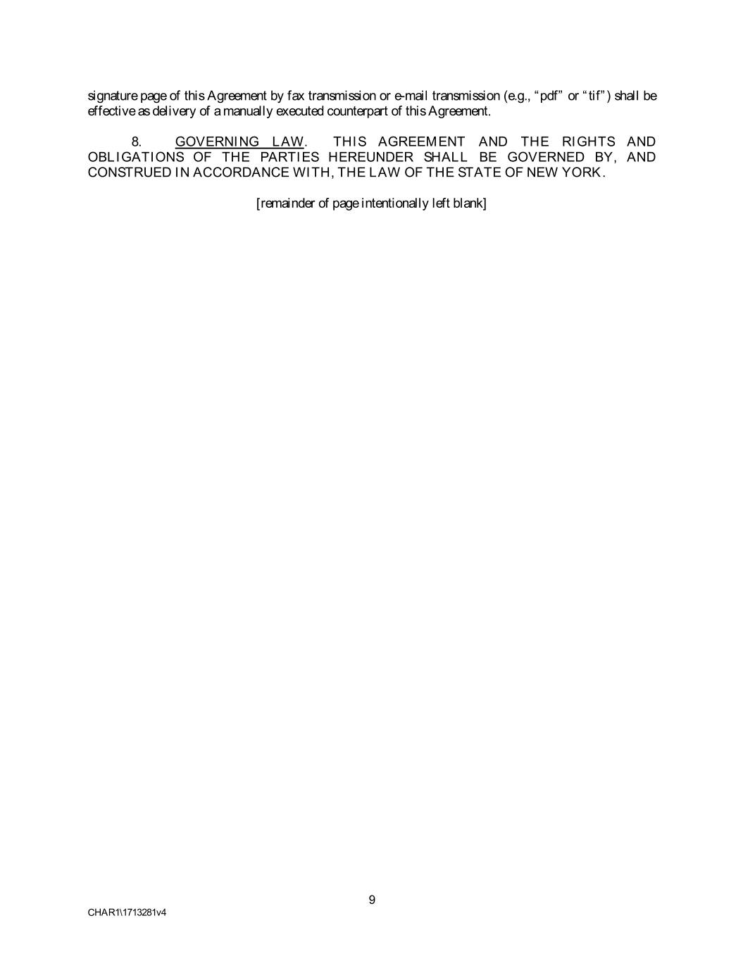 signature page of this Agreement by fax transmission or e-mail transmission (e.g., “pdf” or “tif”) shall be effective as delivery of a manually executed counterpart of this Agreement. 8. GOVERNING LAW. THIS AGREEMENT AND THE RIGHTS AND OBLIGATIONS OF THE PARTIES HEREUNDER SHALL BE GOVERNED BY, AND CONSTRUED IN ACCORDANCE WITH, THE LAW OF THE STATE OF NEW YORK. [remainder of page intentionally left blank] 9 CHAR1\1713281v4