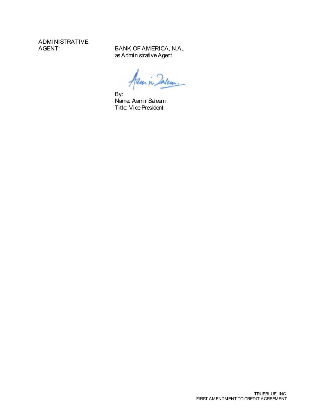 ADMINISTRATIVE AGENT: BANK OF AMERICA, N.A., as Administrative Agent By: Name: Aamir Saleem Title: Vice President TRUEBLUE, INC. FIRST AMENDMENT TO CREDIT AGREEMENT