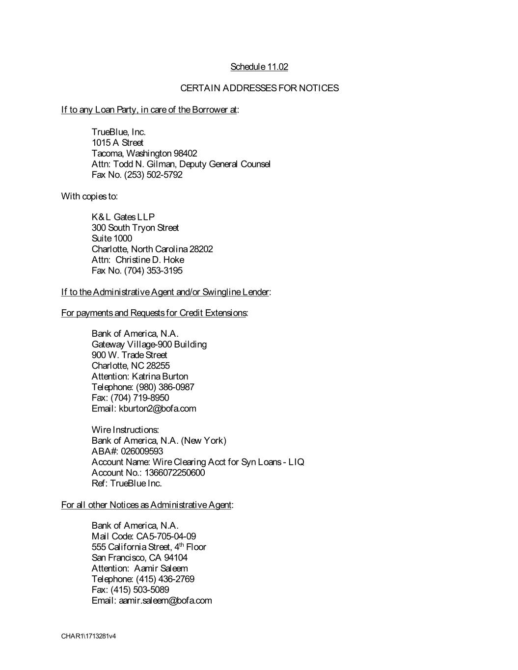 Schedule 11.02 CERTAIN ADDRESSES FOR NOTICES If to any Loan Party, in care of the Borrower at: TrueBlue, Inc. 1015 A Street Tacoma, Washington 98402 Attn: Todd N. Gilman, Deputy General Counsel Fax No. (253) 502-5792 With copies to: K&L Gates LLP 300 South Tryon Street Suite 1000 Charlotte, North Carolina 28202 Attn: Christine D. Hoke Fax No. (704) 353-3195 If to the Administrative Agent and/or Swingline Lender: For payments and Requests for Credit Extensions: Bank of America, N.A. Gateway Village-900 Building 900 W. Trade Street Charlotte, NC 28255 Attention: Katrina Burton Telephone: (980) 386-0987 Fax: (704) 719-8950 Email: kburton2@bofa.com Wire Instructions: Bank of America, N.A. (New York) ABA#: 026009593 Account Name: Wire Clearing Acct for Syn Loans - LIQ Account No.: 1366072250600 Ref: TrueBlue Inc. For all other Notices as Administrative Agent: Bank of America, N.A. Mail Code: CA5-705-04-09 555 California Street, 4th Floor San Francisco, CA 94104 Attention: Aamir Saleem Telephone: (415) 436-2769 Fax: (415) 503-5089 Email: aamir.saleem@bofa.com CHAR1\1713281v4