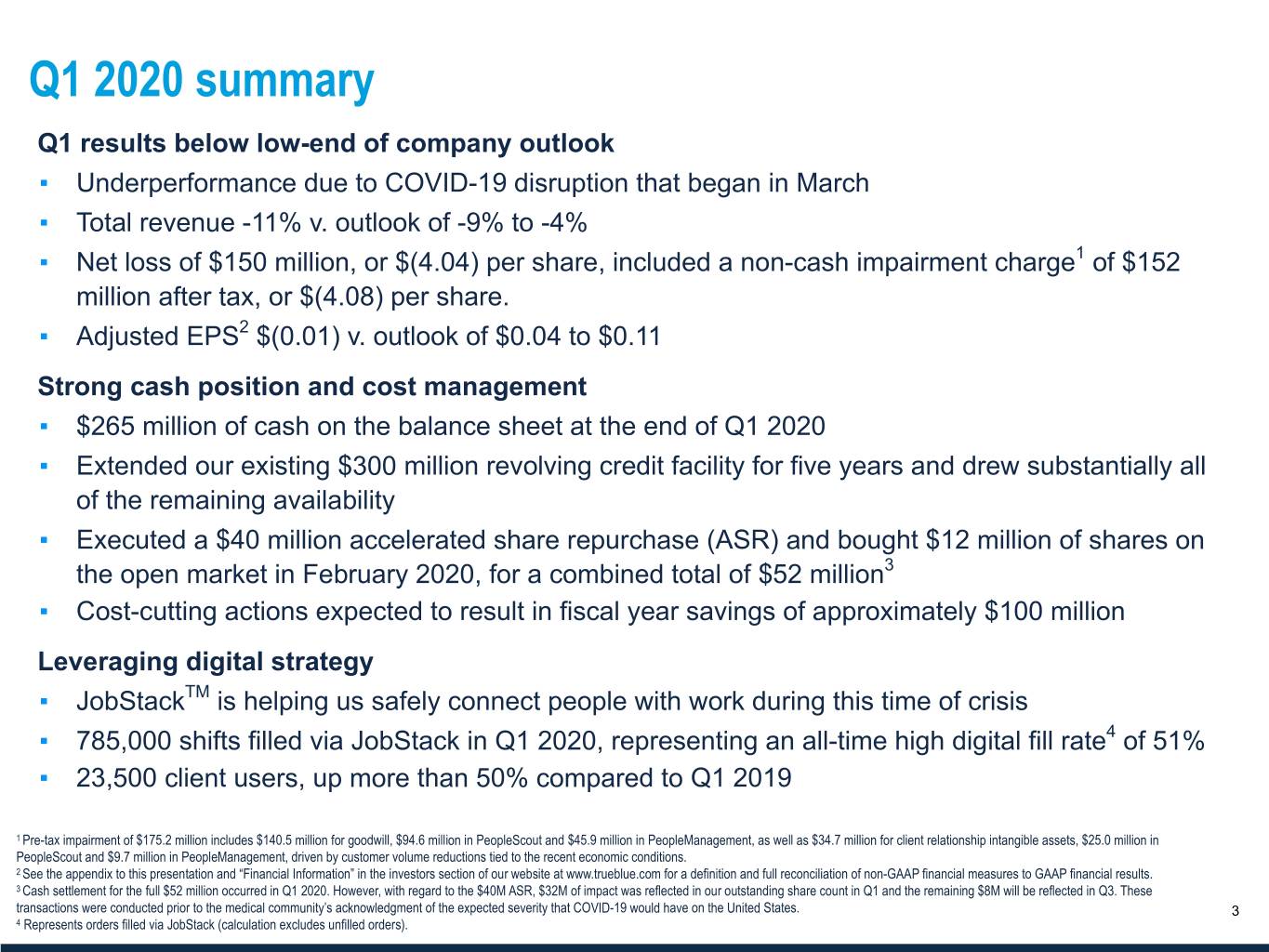 Forward-looking statements This document contains forward-looking statements relating to our plans and expectations, all of which are subject to risks and uncertainties. Such statements are based on management’s expectations and assumptions as of the date of this release and involve many risks and uncertainties that could cause actual results to differ materially from those expressed or implied in our forward-looking statements including: (1) national and global economic conditions, (2) the continued impact of COVID-19 and related economic impact and governmental response, (3) our ability to successfully reduce operating expenses and otherwise adapt to the changing economic environment caused by COVID–19, (4) our ability to access sufficient capital to finance our operations, including our ability to comply with or obtain waivers for covenants contained in our revolving credit facility, (5) our ability to attract and retain clients, (6) our ability to attract sufficient qualified candidates and employees to meet the needs of our clients, (7) our ability to maintain profit margins, (8) new laws and regulations that could affect our operations or financial results, (9) our ability to successfully execute on business strategies to further digitize our business model, and (10) any reduction or change in tax credits we utilize, including the Work Opportunity Tax Credit. Other information regarding factors that could affect our results is included in our Securities Exchange Commission (SEC) filings, including the company’s most recent reports on Forms 10-K and 10-Q, copies of which may be obtained by visiting our website at www.trueblue.com under the Investor Relations section or the SEC’s website at www.sec.gov. We assume no obligation to update or revise any forward-looking statement, whether as a result of new information, future events, or otherwise, except as required by law. Any other references to future financial estimates are included for informational purposes only and subject to risk factors discussed in our most recent filings with the SEC. In addition, we use several non-GAAP financial measures when presenting our financial results in this document. Please refer to the reconciliations between our GAAP and non-GAAP financial measures in the appendix to this presentation and on our website at www.trueblue.com under the Investor Relations section for additional information on both current and historical periods. The presentation of these non-GAAP financial measures is used to enhance the understanding of certain aspects of our financial performance. It is not meant to be considered in isolation, superior to, or as a substitute for the directly comparable financial measures prepared in accordance with U.S. GAAP, and may not be comparable to similarly titled measures of other companies. Any comparisons made herein to other periods are based on a comparison to the same period in the prior year unless otherwise stated. www.TrueBlue.com 2
