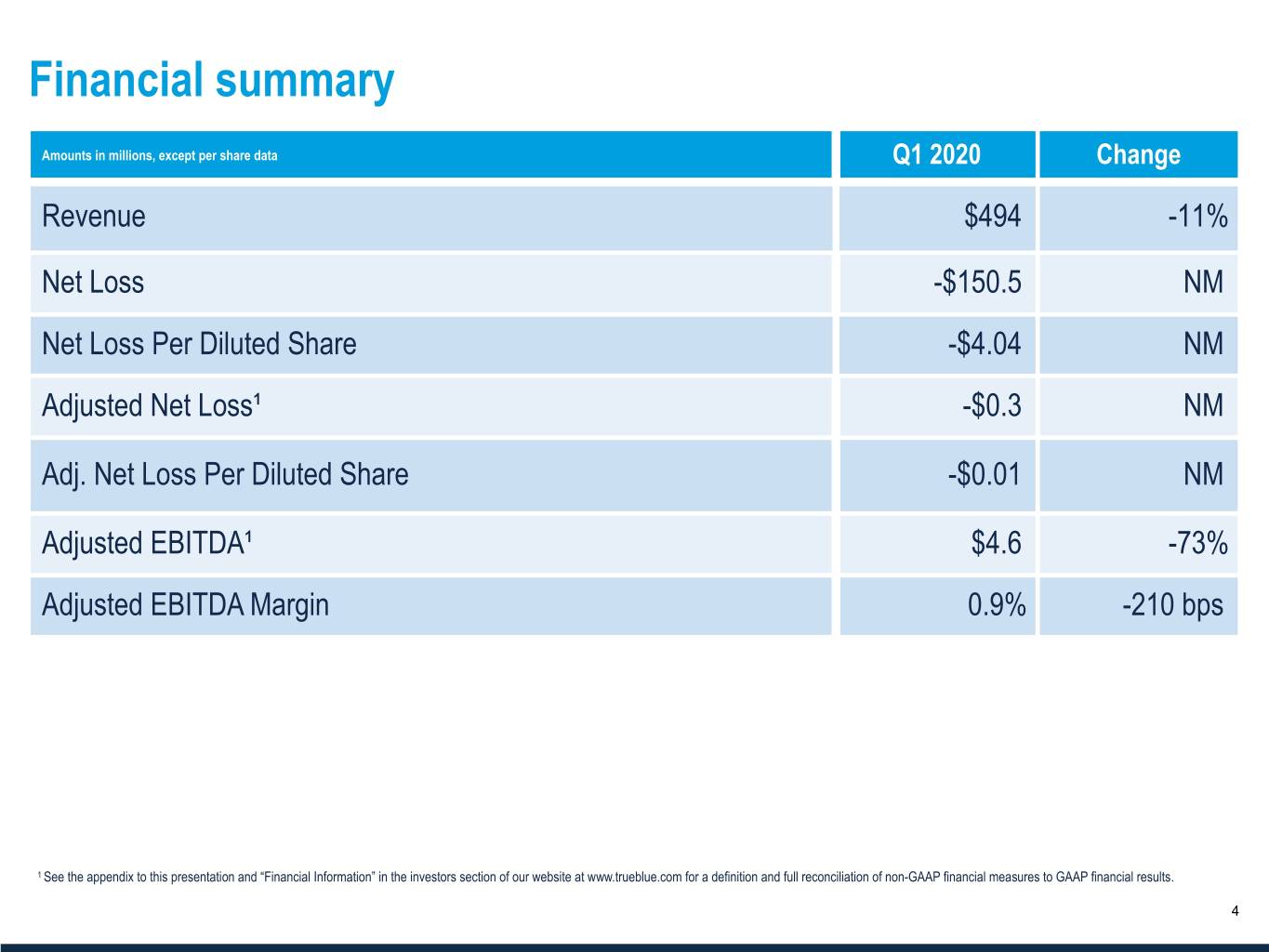 Q1 2020 summary Q1 results below low-end of company outlook ▪ Underperformance due to COVID-19 disruption that began in March ▪ Total revenue -11% v. outlook of -9% to -4% ▪ Net loss of $150 million, or $(4.04) per share, included a non-cash impairment charge1 of $152 million after tax, or $(4.08) per share. ▪ Adjusted EPS2 $(0.01) v. outlook of $0.04 to $0.11 Strong cash position and cost management ▪ $265 million of cash on the balance sheet at the end of Q1 2020 ▪ Extended our existing $300 million revolving credit facility for five years and drew substantially all of the remaining availability ▪ Executed a $40 million accelerated share repurchase (ASR) and bought $12 million of shares on the open market in February 2020, for a combined total of $52 million3 ▪ Cost-cutting actions expected to result in fiscal year savings of approximately $100 million Leveraging digital strategy ▪ JobStackTM is helping us safely connect people with work during this time of crisis ▪ 785,000 shifts filled via JobStack in Q1 2020, representing an all-time high digital fill rate4 of 51% ▪ 23,500 client users, up more than 50% compared to Q1 2019 1 Pre-tax impairment of $175.2 million includes $140.5 million for goodwill, $94.6 million in PeopleScout and $45.9 million in PeopleManagement, as well as $34.7 million for client relationship intangible assets, $25.0 million in PeopleScout and $9.7 million in PeopleManagement, driven by customer volume reductions tied to the recent economic conditions. 2 See the appendix to this presentation and “Financial Information” in the investors section of our website at www.trueblue.com for a definition and full reconciliation of non-GAAP financial measures to GAAP financial results. 3 Cash settlement for the full $52 million occurred in Q1 2020. However, with regard to the $40M ASR, $32M of impact was reflected in our outstanding share count in Q1 and the remaining $8M will be reflected in Q3. These transactionswww.TrueBlue.com were conducted prior to the medical community’s acknowledgment of the expected severity that COVID-19 would have on the United States. 3 4 Represents orders filled via JobStack (calculation excludes unfilled orders).