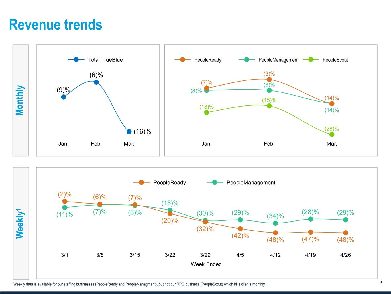 Financial summary Amounts in millions, except per share data Q1 2020 Change Revenue $494 -11% Net Loss -$150.5 NM Net Loss Per Diluted Share -$4.04 NM Adjusted Net Loss¹ -$0.3 NM Adj. Net Loss Per Diluted Share -$0.01 NM Adjusted EBITDA¹ $4.6 -73% Adjusted EBITDA Margin 0.9% -210 bps 1 See the appendix to this presentation and “Financial Information” in the investors section of our website at www.trueblue.com for a definition and full reconciliation of non-GAAP financial measures to GAAP financial results. www.TrueBlue.com 4