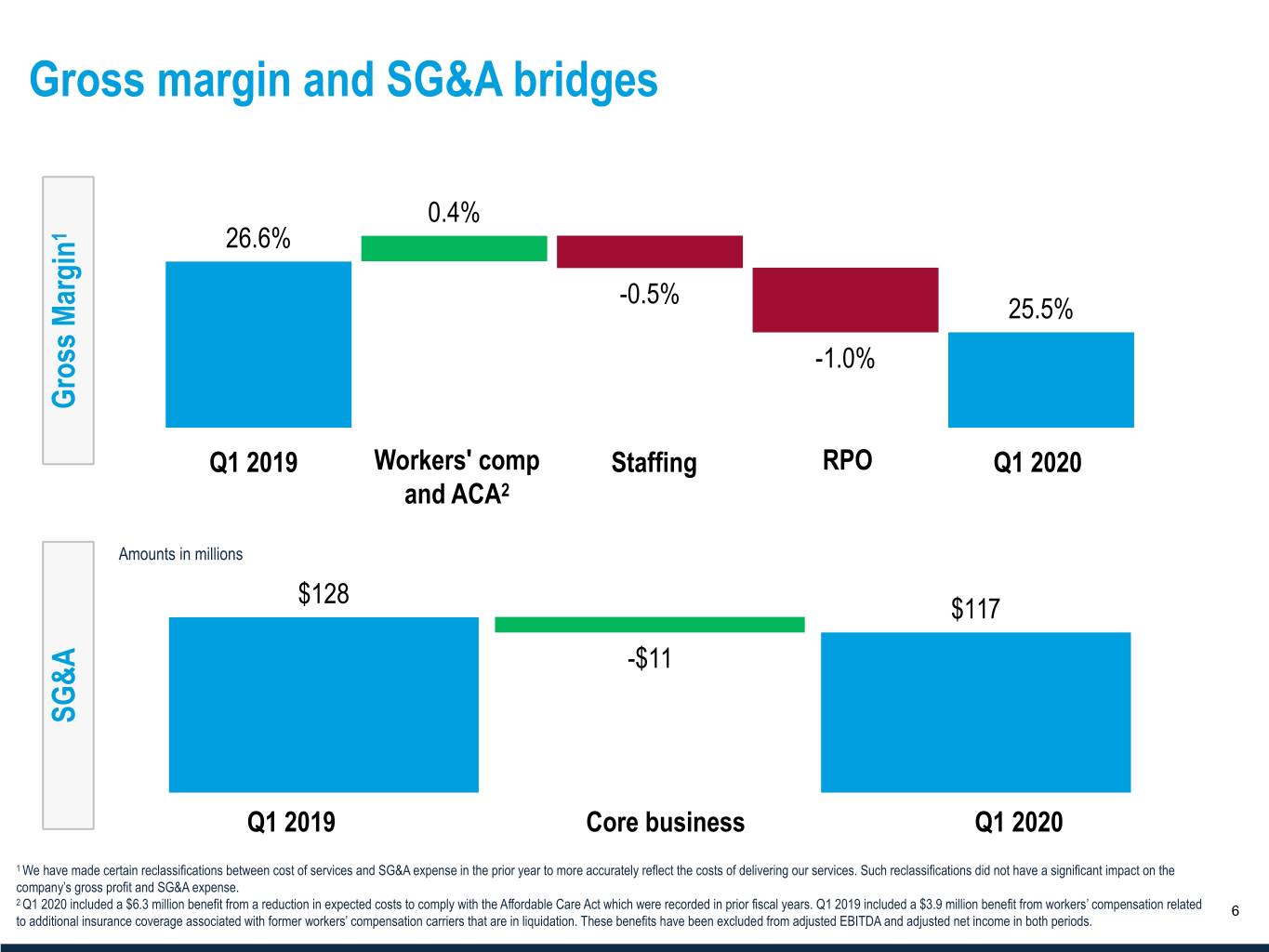 Gross margin and SG&A bridges 0.4% 1 26.6% -0.5% 25.5% -1.0% Gross Margin Q1 2019 Workers' comp Staffing RPO Q1 2020 and ACA2 Amounts in millions $128 $117 -$11 SG&A Q1 2019 Core business Q1 2020 1 We have made certain reclassifications between cost of services and SG&A expense in the prior year to more accurately reflect the costs of delivering our services. Such reclassifications did not have a significant impact on the company’s gross profit and SG&A expense. 2 Q1www.TrueBlue.com 2020 included a $6.3 million benefit from a reduction in expected costs to comply with the Affordable Care Act which were recorded in prior fiscal years. Q1 2019 included a $3.9 million benefit from workers’ compensation related 6 to additional insurance coverage associated with former workers’ compensation carriers that are in liquidation. These benefits have been excluded from adjusted EBITDA and adjusted net income in both periods.