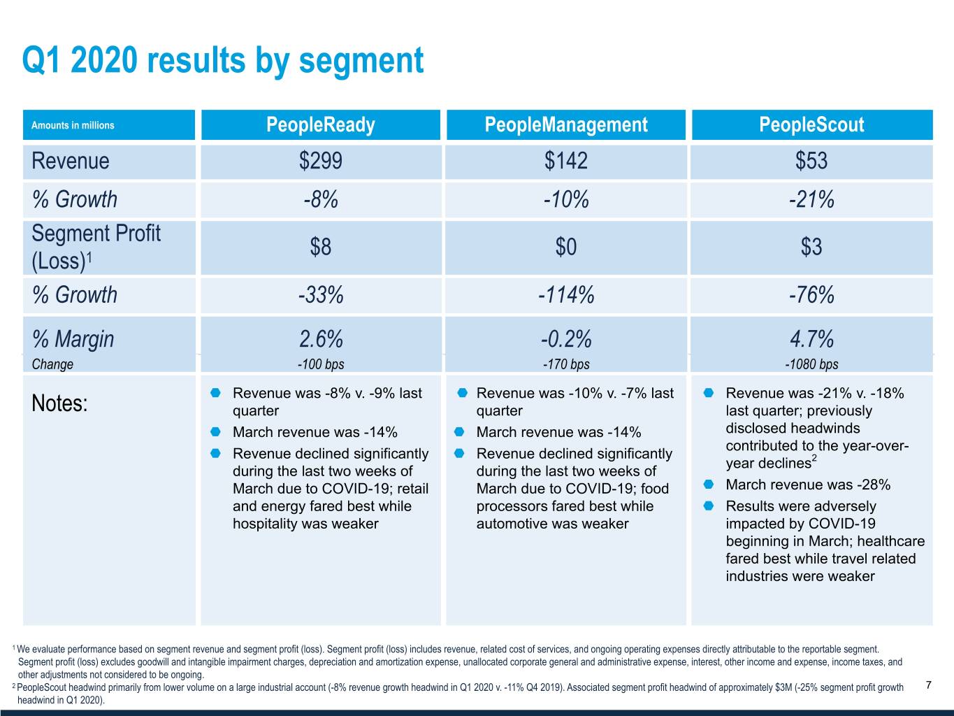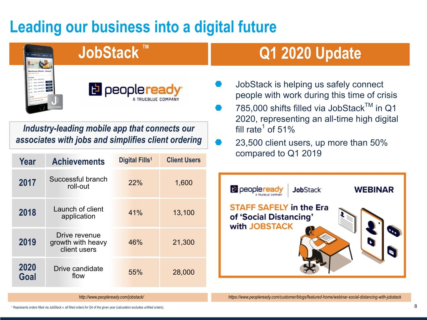 Q1 2020 results by segment Amounts in millions PeopleReady PeopleManagement PeopleScout Revenue $299 $142 $53 % Growth -8% -10% -21% Segment Profit $8 $0 $3 (Loss)1 % Growth -33% -114% -76% % Margin 2.6% -0.2% 4.7% Change -100 bps -170 bps -1080 bps ¬ Revenue was -8% v. -9% last ¬ Revenue was -10% v. -7% last ¬ Revenue was -21% v. -18% Notes: quarter quarter last quarter; previously ¬ March revenue was -14% ¬ March revenue was -14% disclosed headwinds contributed to the year-over- ¬ Revenue declined significantly ¬ Revenue declined significantly year declines2 during the last two weeks of during the last two weeks of ¬ March due to COVID-19; retail March due to COVID-19; food March revenue was -28% and energy fared best while processors fared best while ¬ Results were adversely hospitality was weaker automotive was weaker impacted by COVID-19 beginning in March; healthcare fared best while travel related industries were weaker 1 We evaluate performance based on segment revenue and segment profit (loss). Segment profit (loss) includes revenue, related cost of services, and ongoing operating expenses directly attributable to the reportable segment. Segment profit (loss) excludes goodwill and intangible impairment charges, depreciation and amortization expense, unallocated corporate general and administrative expense, interest, other income and expense, income taxes, and other adjustments not considered to be ongoing. 2 PeopleScoutwww.TrueBlue.com headwind primarily from lower volume on a large industrial account (-8% revenue growth headwind in Q1 2020 v. -11% Q4 2019). Associated segment profit headwind of approximately $3M (-25% segment profit growth 7 headwind in Q1 2020).