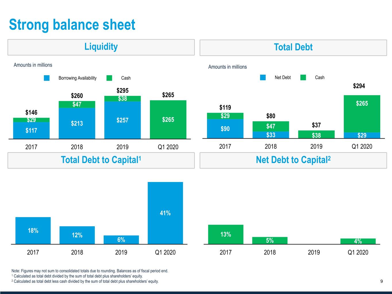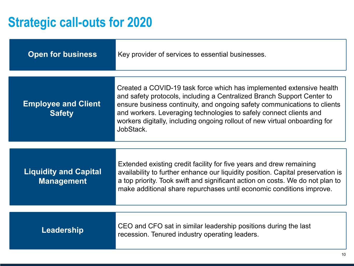 Strong balance sheet Liquidity Total Debt Amounts in millions Amounts in millions Borrowing Availability Cash Net Debt Cash $294 $295 $265 $260 $38 $265 $47 $119 $146 $29 $80 $29 $257 $265 $213 $47 $37 $117 $90 $33 $38 $29 2017 2018 2019 Q1 2020 2017 2018 2019 Q1 2020 Total Debt to Capital1 Net Debt to Capital2 41% 18% 12% 13% —% 6% 5% 4% 2017 2018 2019 Q1 2020 2017 2018 2019 Q1 2020 Note: Figures may not sum to consolidated totals due to rounding. Balances as of fiscal period end. 1 Calculated as total debt divided by the sum of total debt plus shareholders’ equity. www.TrueBlue.com2 Calculated as total debt less cash divided by the sum of total debt plus shareholders’ equity. 9