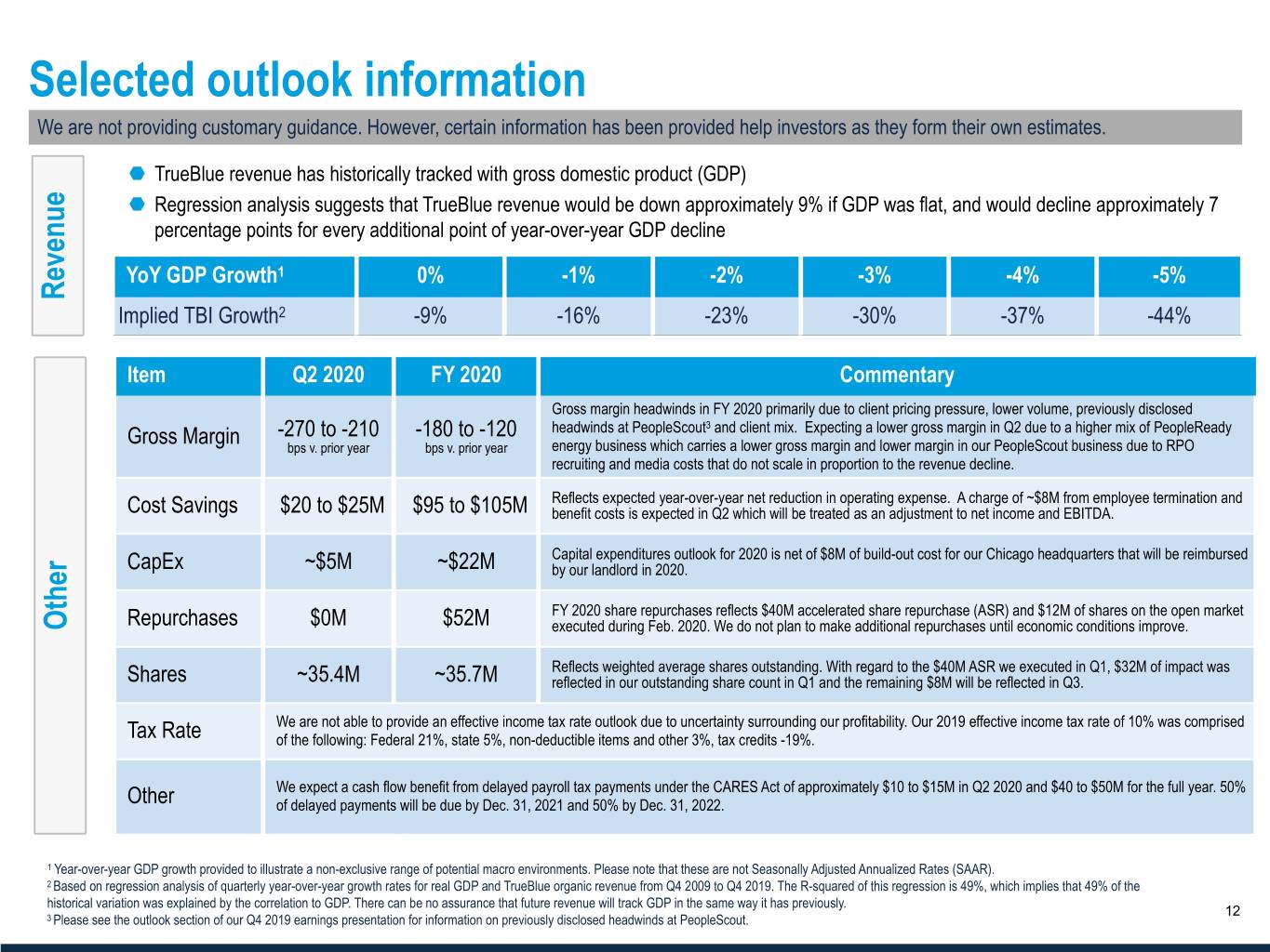 Selected outlook information We are not providing customary guidance. However, certain information has been provided help investors as they form their own estimates. ¬ TrueBlue revenue has historically tracked with gross domestic product (GDP) ¬ Regression analysis suggests that TrueBlue revenue would be down approximately 9% if GDP was flat, and would decline approximately 7 percentage points for every additional point of year-over-year GDP decline YoY GDP Growth1 0% -1% -2% -3% -4% -5% Revenue Implied TBI Growth2 -9% -16% -23% -30% -37% -44% Item Q2 2020 FY 2020 Commentary Gross margin headwinds in FY 2020 primarily due to client pricing pressure, lower volume, previously disclosed Gross Margin -270 to -210 -180 to -120 headwinds at PeopleScout3 and client mix. Expecting a lower gross margin in Q2 due to a higher mix of PeopleReady bps v. prior year bps v. prior year energy business which carries a lower gross margin and lower margin in our PeopleScout business due to RPO recruiting and media costs that do not scale in proportion to the revenue decline. Reflects expected year-over-year net reduction in operating expense. A charge of ~$8M from employee termination and Cost Savings $20 to $25M $95 to $105M benefit costs is expected in Q2 which will be treated as an adjustment to net income and EBITDA. Capital expenditures outlook for 2020 is net of $8M of build-out cost for our Chicago headquarters that will be reimbursed CapEx ~$5M ~$22M by our landlord in 2020. FY 2020 share repurchases reflects $40M accelerated share repurchase (ASR) and $12M of shares on the open market Other Repurchases $0M $52M executed during Feb. 2020. We do not plan to make additional repurchases until economic conditions improve. Reflects weighted average shares outstanding. With regard to the $40M ASR we executed in Q1, $32M of impact was Shares ~35.4M ~35.7M reflected in our outstanding share count in Q1 and the remaining $8M will be reflected in Q3. We are not able to provide an effective income tax rate outlook due to uncertainty surrounding our profitability. Our 2019 effective income tax rate of 10% was comprised Tax Rate of the following: Federal 21%, state 5%, non-deductible items and other 3%, tax credits -19%. We expect a cash flow benefit from delayed payroll tax payments under the CARES Act of approximately $10 to $15M in Q2 2020 and $40 to $50M for the full year. 50% Other of delayed payments will be due by Dec. 31, 2021 and 50% by Dec. 31, 2022. 1 Year-over-year GDP growth provided to illustrate a non-exclusive range of potential macro environments. Please note that these are not Seasonally Adjusted Annualized Rates (SAAR). 2 Based on regression analysis of quarterly year-over-year growth rates for real GDP and TrueBlue organic revenue from Q4 2009 to Q4 2019. The R-squared of this regression is 49%, which implies that 49% of the historical variation was explained by the correlation to GDP. There can be no assurance that future revenue will track GDP in the same way it has previously. www.TrueBlue.com 12 3 Please see the outlook section of our Q4 2019 earnings presentation for information on previously disclosed headwinds at PeopleScout. PeopleScout Client Headwinds Q1 Q2 Q3 Q4 Revenue Headwind -$5 -$4 -$2 $0 l As previously disclosed, PeopleScout headwind from one client lost after being acquired and less volume / lower margins on another large account. The first client had no order volume starting in Q2 2019 and Segment Profit Headwind -$3 -$2 -$1 $0 the second client had no order volume in Q4 2019.