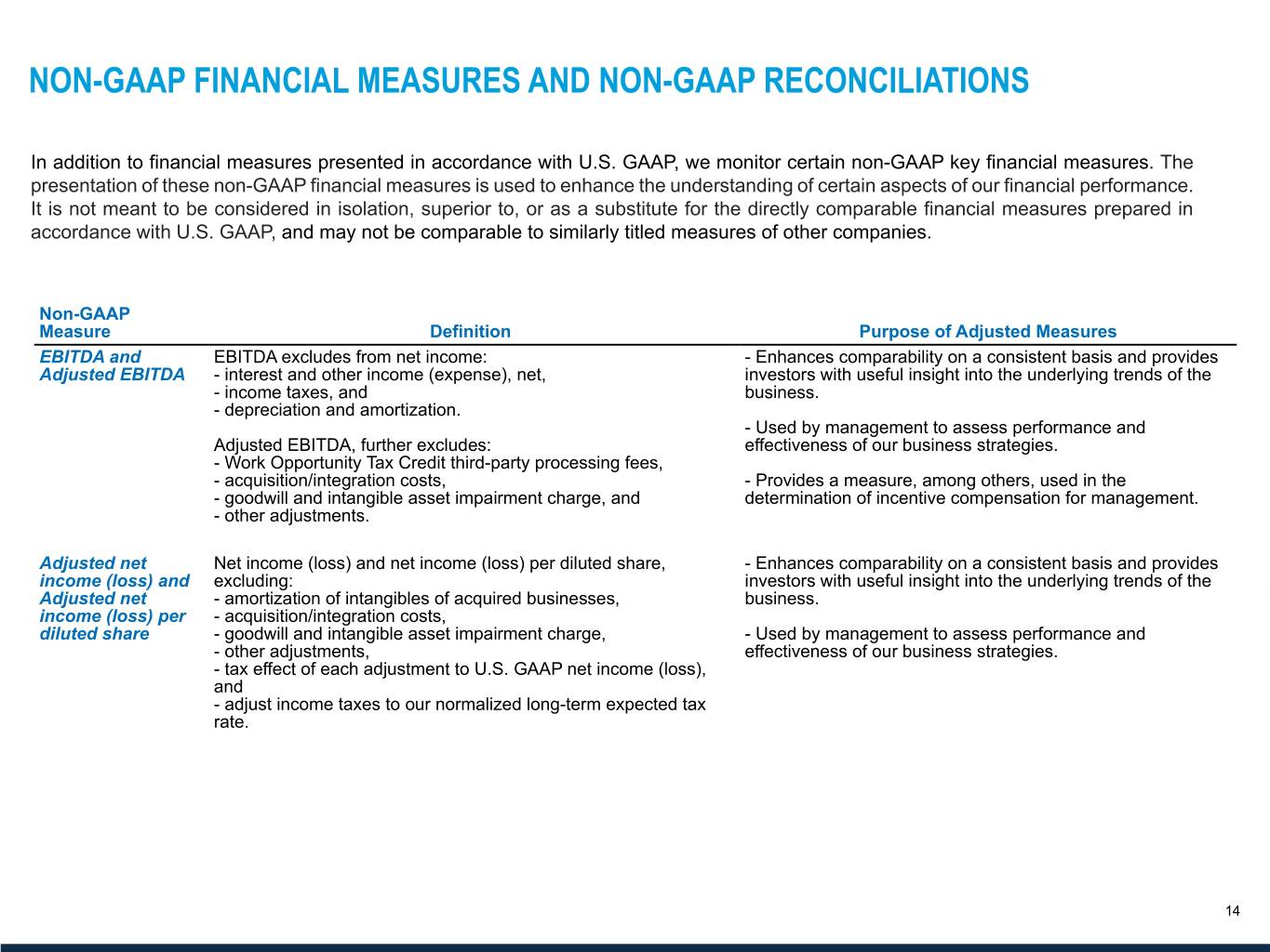 NON-GAAP FINANCIAL MEASURES AND NON-GAAP RECONCILIATIONS In addition to financial measures presented in accordance with U.S. GAAP, we monitor certain non-GAAP key financial measures. The presentation of these non-GAAP financial measures is used to enhance the understanding of certain aspects of our financial performance. It is not meant to be considered in isolation, superior to, or as a substitute for the directly comparable financial measures prepared in accordance with U.S. GAAP, and may not be comparable to similarly titled measures of other companies. Non-GAAP Measure Definition Purpose of Adjusted Measures EBITDA and EBITDA excludes from net income: - Enhances comparability on a consistent basis and provides Adjusted EBITDA - interest and other income (expense), net, investors with useful insight into the underlying trends of the - income taxes, and business. - depreciation and amortization. - Used by management to assess performance and Adjusted EBITDA, further excludes: effectiveness of our business strategies. - Work Opportunity Tax Credit third-party processing fees, - acquisition/integration costs, - Provides a measure, among others, used in the - goodwill and intangible asset impairment charge, and determination of incentive compensation for management. - other adjustments. Adjusted net Net income (loss) and net income (loss) per diluted share, - Enhances comparability on a consistent basis and provides income (loss) and excluding: investors with useful insight into the underlying trends of the Adjusted net - amortization of intangibles of acquired businesses, business. income (loss) per - acquisition/integration costs, diluted share - goodwill and intangible asset impairment charge, - Used by management to assess performance and - other adjustments, effectiveness of our business strategies. - tax effect of each adjustment to U.S. GAAP net income (loss), and - adjust income taxes to our normalized long-term expected tax rate. www.TrueBlue.com 14