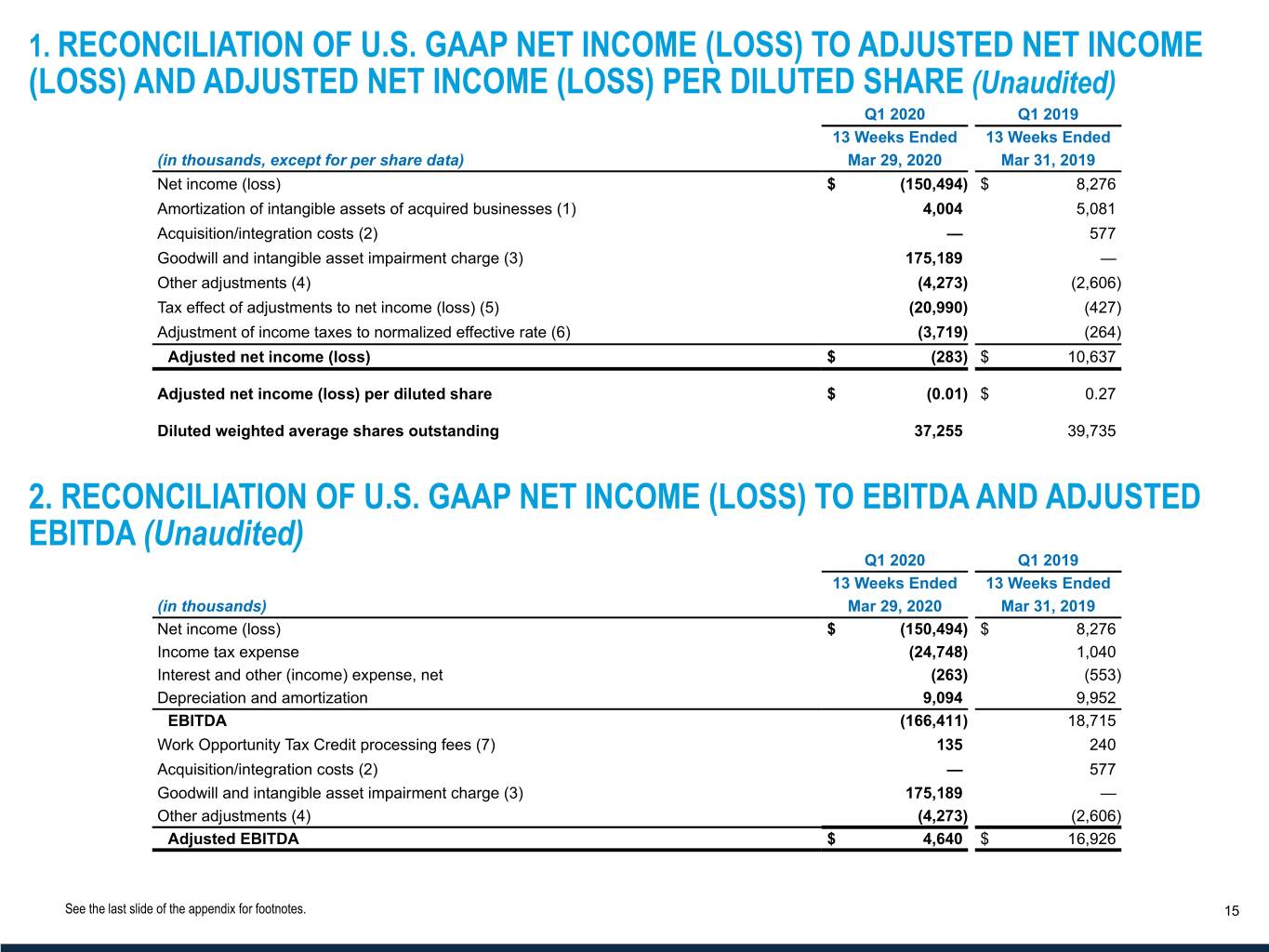 1. RECONCILIATION OF U.S. GAAP NET INCOME (LOSS) TO ADJUSTED NET INCOME (LOSS) AND ADJUSTED NET INCOME (LOSS) PER DILUTED SHARE (Unaudited) Q1 2020 Q1 2019 13 Weeks Ended 13 Weeks Ended (in thousands, except for per share data) Mar 29, 2020 Mar 31, 2019 Net income (loss) $ (150,494) $ 8,276 Amortization of intangible assets of acquired businesses (1) 4,004 5,081 Acquisition/integration costs (2) — 577 Goodwill and intangible asset impairment charge (3) 175,189 — Other adjustments (4) (4,273) (2,606) Tax effect of adjustments to net income (loss) (5) (20,990) (427) Adjustment of income taxes to normalized effective rate (6) (3,719) (264) Adjusted net income (loss) $ (283) $ 10,637 Adjusted net income (loss) per diluted share $ (0.01) $ 0.27 Diluted weighted average shares outstanding 37,255 39,735 2. RECONCILIATION OF U.S. GAAP NET INCOME (LOSS) TO EBITDA AND ADJUSTED EBITDA (Unaudited) Q1 2020 Q1 2019 13 Weeks Ended 13 Weeks Ended (in thousands) Mar 29, 2020 Mar 31, 2019 Net income (loss) $ (150,494) $ 8,276 Income tax expense (24,748) 1,040 Interest and other (income) expense, net (263) (553) Depreciation and amortization 9,094 9,952 EBITDA (166,411) 18,715 Work Opportunity Tax Credit processing fees (7) 135 240 Acquisition/integration costs (2) — 577 Goodwill and intangible asset impairment charge (3) 175,189 — Other adjustments (4) (4,273) (2,606) Adjusted EBITDA $ 4,640 $ 16,926 www.TrueBlue.comSee the last slide of the appendix for footnotes. 15