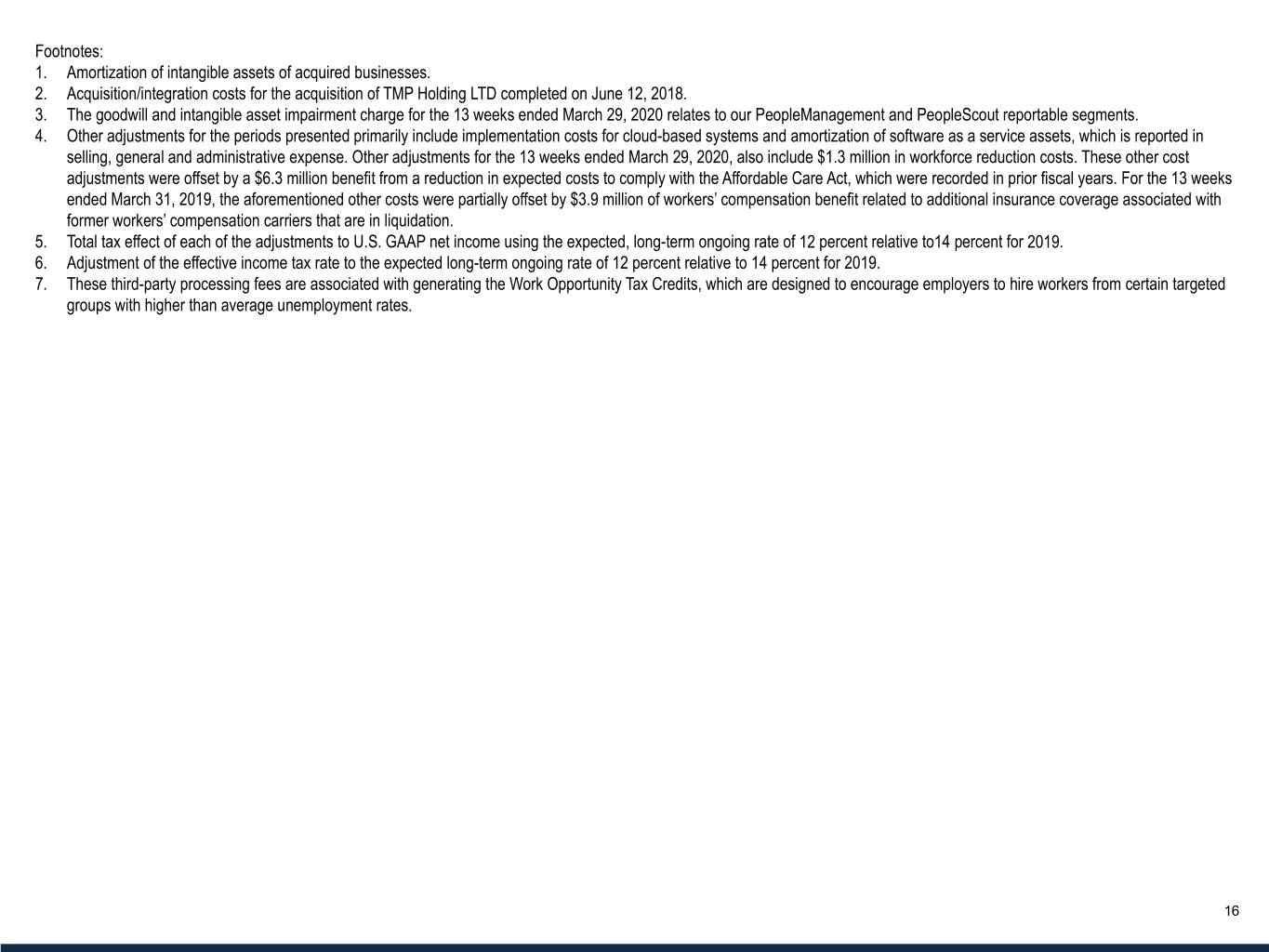 Footnotes: 1. Amortization of intangible assets of acquired businesses. 2. Acquisition/integration costs for the acquisition of TMP Holding LTD completed on June 12, 2018. 3. The goodwill and intangible asset impairment charge for the 13 weeks ended March 29, 2020 relates to our PeopleManagement and PeopleScout reportable segments. 4. Other adjustments for the periods presented primarily include implementation costs for cloud-based systems and amortization of software as a service assets, which is reported in selling, general and administrative expense. Other adjustments for the 13 weeks ended March 29, 2020, also include $1.3 million in workforce reduction costs. These other cost adjustments were offset by a $6.3 million benefit from a reduction in expected costs to comply with the Affordable Care Act, which were recorded in prior fiscal years. For the 13 weeks ended March 31, 2019, the aforementioned other costs were partially offset by $3.9 million of workers’ compensation benefit related to additional insurance coverage associated with former workers’ compensation carriers that are in liquidation. 5. Total tax effect of each of the adjustments to U.S. GAAP net income using the expected, long-term ongoing rate of 12 percent relative to14 percent for 2019. 6. Adjustment of the effective income tax rate to the expected long-term ongoing rate of 12 percent relative to 14 percent for 2019. 7. These third-party processing fees are associated with generating the Work Opportunity Tax Credits, which are designed to encourage employers to hire workers from certain targeted groups with higher than average unemployment rates. www.TrueBlue.com 16