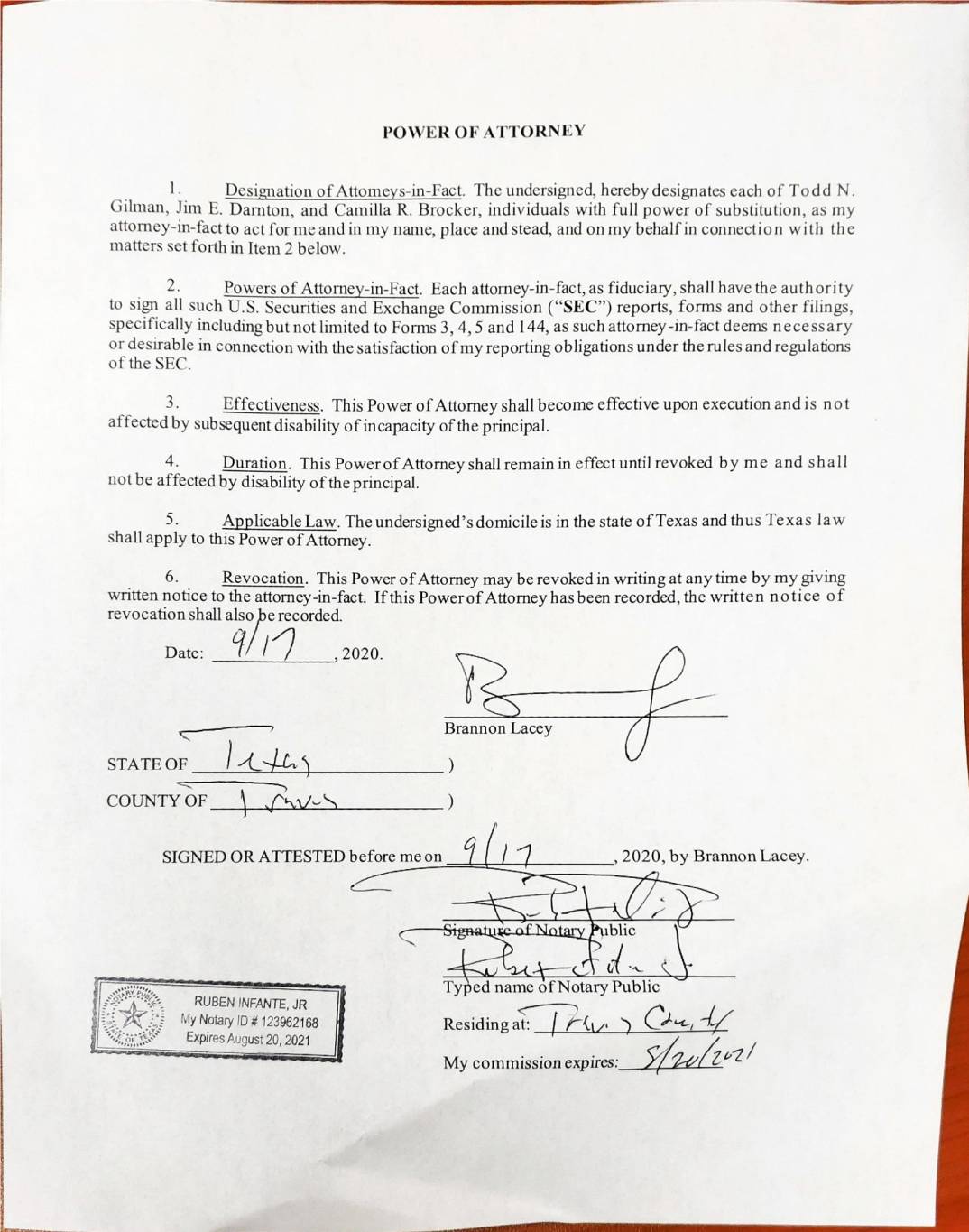 POWER OF ATTORNEY 1. Designation of Attomeys-in-Fact. The undersigned, hereby designates each of Todd N. Gilman, Jim E. Damton, and Camilla R. Brocker, individuals with full power of substitution, as my attorney-in-fact to act for me and in my name, place and stead, and on my behalf in connection with the matters set forth in Item 2 below. 2. Powers of Attorney-in-Fact. Each attorney-in-fact, as fiduciary, shall have the authority to sign all such U.S. Securities and Exchange Commission ("SEC") reports, forms and other filings, specifically including but not limited to Forms 3, 4, 5 and 144, as such attorney-in-fact deems necessary or desirable in connection with the satisfaction of my reporting obligations under the rules and regulations of the SEC. 3. Effectiveness. This Power of Attorney shall become effective upon execution and is not affected by subsequent disability of incapacity of the principal. 4. Duration. This PowerofAttorney shallremainin effect until revoked by me and shall not be affected by disability of the principal. 5. Applicable Law. The undersigned's domicile is in the state of Texas and thus Texas law shall apply to this Power of Attorney. 6. Revocation. This Power of Attorney may be revoked in writing at any time by my giving written notice to the attorney-in-fact. If this Power of Attorney has been recorded, the written notice of revocation shall also e recorded, Date: 2020. Brannon Lacey STATE OF ) COUNTY OF SIGNED OR ATTESTED before me on 2020, by Brannon Lacey. blic Ty ed name ofNotary Public RUBEN INFANTE,JR NotaryID # 123962168 Residing at: Expires August 20, 2021 My commission expires: