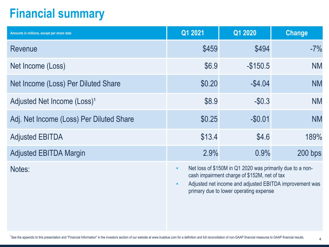 www.TrueBlue.c om 3 Q1 2021 Overview 1 See the appendix to this presentation and “Financial Information” in the investors section of our website at www.trueblue.com for a definition and full reconciliation of non-GAAP financial measures to GAAP financial results. 2 Borrowing Availability is based on maximum borrowing availability under our most restrictive covenant, which was Minimum Asset Coverage for Q1 2021. Revenue recovery and cost management continue to drive results ▪ Total revenue -7% v. -12% in Q4 2020 - better trends across all segments ▪ SG&A -17% from disciplined cost management ▪ Net income was $7 million v. a net loss of $150 million in Q1 2020 • Q1 2020 included a non-cash impairment charge of $152 million, net of tax ▪ Adj. net income1 was $9 million v. adj. net loss of $0.3 million in Q1 2020 ▪ Adj. EBITDA increased 189% and margin was up 200 basis points Strong capital position ▪ Cash of $88 million and no debt outstanding ▪ Credit facility provides $150 million2 available for borrowing
