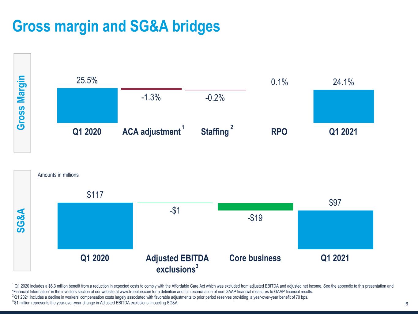 www.TrueBlue.c om 5 Revenue trends Quarter Month ended Apr 2,3 Q1 Jan Feb1 Mar Week 1 Week 2 Week 3 TrueBlue (7)% (12)% (14)% 3% 31% 45% 53% PeopleReady (13)% (18)% (19)% (3)% 31% 45% 57% PeopleManagement 7% 5% 0% 15% 30% 46% 47% PeopleScout (13)% (25)% (18)% 4% NA NA NA 1 February 2021 revenue trends were impacted by weather in the U.S. 2 Easter fell in the 1st week of April this year versus the 2nd week in 2020. 3 TrueBlue represents aggregate revenue results for PeopleReady and PeopleManagement. Weekly data is not available for PeopleScout, which bills clients monthly.
