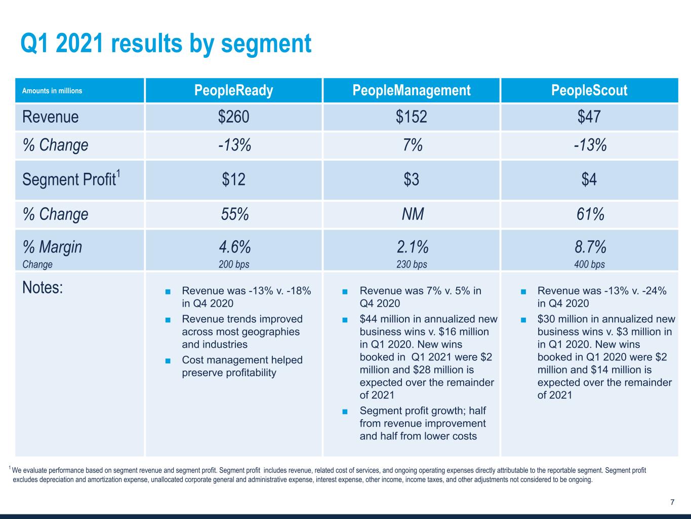 www.TrueBlue.c om 16 Footnotes: (1) Amortization of software as a service assets is reported in selling, general and administrative expense. (2) Workforce reduction costs for the 13 weeks ended March 31, 2020 were primarily due to employee reductions as part of our cost management actions in response to COVID-19. (3) Other adjustments for the 13 weeks ended March 28, 2021 primarily include lease expense of $0.8 million incurred during the build-out phase of our Chicago office and implementation costs for cloud- based systems of $0.1 million. Other adjustments for the 13 weeks ended March 31, 2020 primarily include implementation costs for cloud-based systems of $0.5 million, offset by a $6.3 million benefit from a reduction in expected costs to comply with the Affordable Care Act. (4) Total tax effect of each of the adjustments to U.S. GAAP net income (loss) using the effective income tax rate benefit of 2 percent for Q1 2021 and the expected long-term ongoing income tax rate expense of 12 percent for Q1 2020. (5) Adjustment of the effective income tax rate to the expected long-term ongoing rate of 12 percent for Q1 2020. Beginning in Q2 2020, we decided not to adjust our GAAP tax rate in our adjusted net income (loss) calculation until our profitability rises to a more substantial level. (6) These third-party processing fees are associated with generating the Work Opportunity Tax Credits, which are designed to encourage employers to hire workers from certain targeted groups with higher than average unemployment rates.