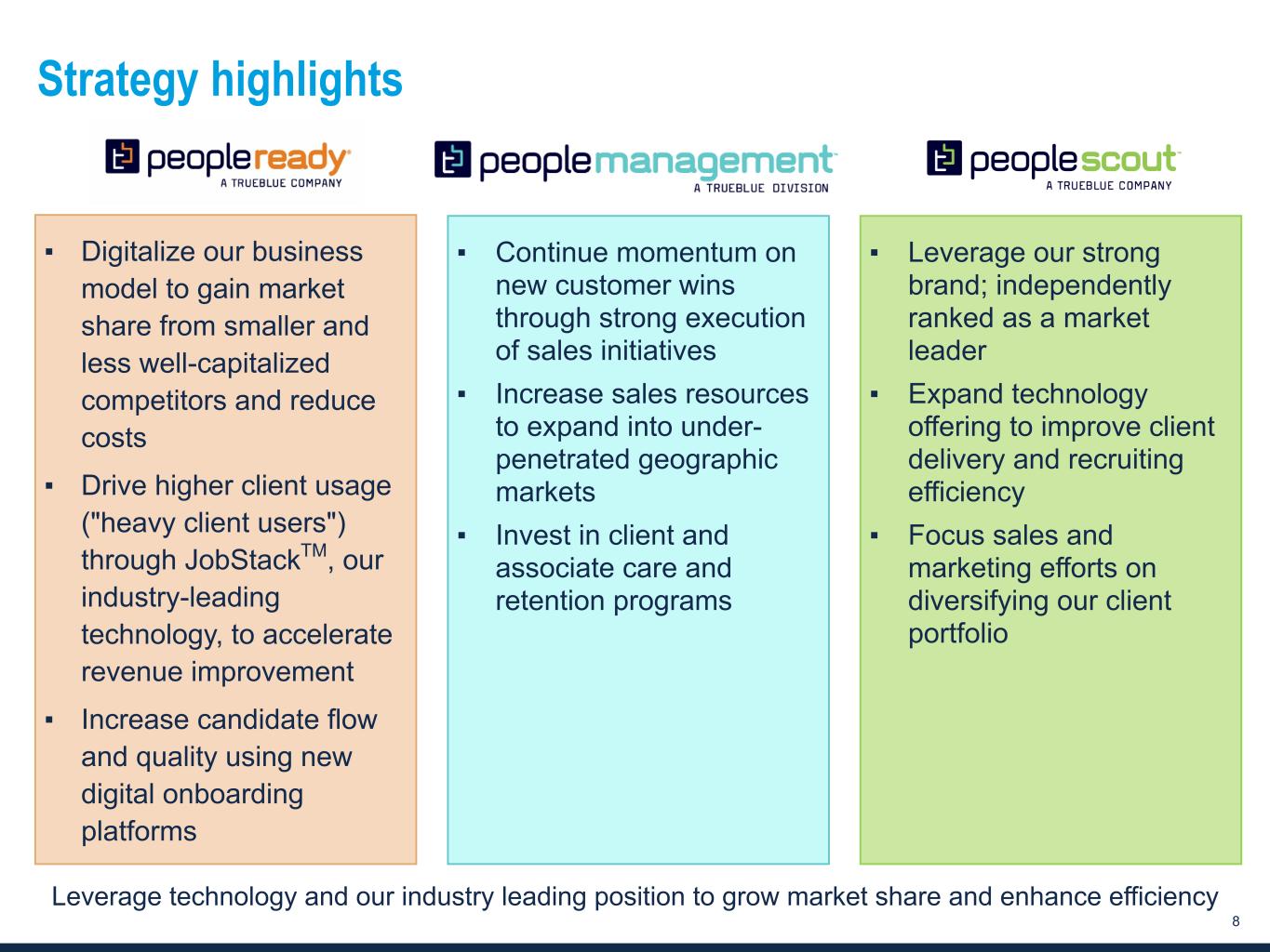 www.TrueBlue.c om 7 Q1 2021 results by segment Amounts in millions PeopleReady PeopleManagement PeopleScout Revenue $260 $152 $47 % Change -13% 7% -13% Segment Profit1 $12 $3 $4 % Change 55% NM 61% % Margin 4.6% 2.1% 8.7% Change 200 bps 230 bps 400 bps Notes: ■ Revenue was -13% v. -18% in Q4 2020 ■ Revenue trends improved across most geographies and industries ■ Cost management helped preserve profitability ■ Revenue was 7% v. 5% in Q4 2020 ■ $44 million in annualized new business wins v. $16 million in Q1 2020. New wins booked in Q1 2021 were $2 million and $28 million is expected over the remainder of 2021 ■ Segment profit growth; half from revenue improvement and half from lower costs ■ Revenue was -13% v. -24% in Q4 2020 ■ $30 million in annualized new business wins v. $3 million in in Q1 2020. New wins booked in Q1 2020 were $2 million and $14 million is expected over the remainder of 2021 1 We evaluate performance based on segment revenue and segment profit. Segment profit includes revenue, related cost of services, and ongoing operating expenses directly attributable to the reportable segment. Segment profit excludes depreciation and amortization expense, unallocated corporate general and administrative expense, interest expense, other income, income taxes, and other adjustments not considered to be ongoing.