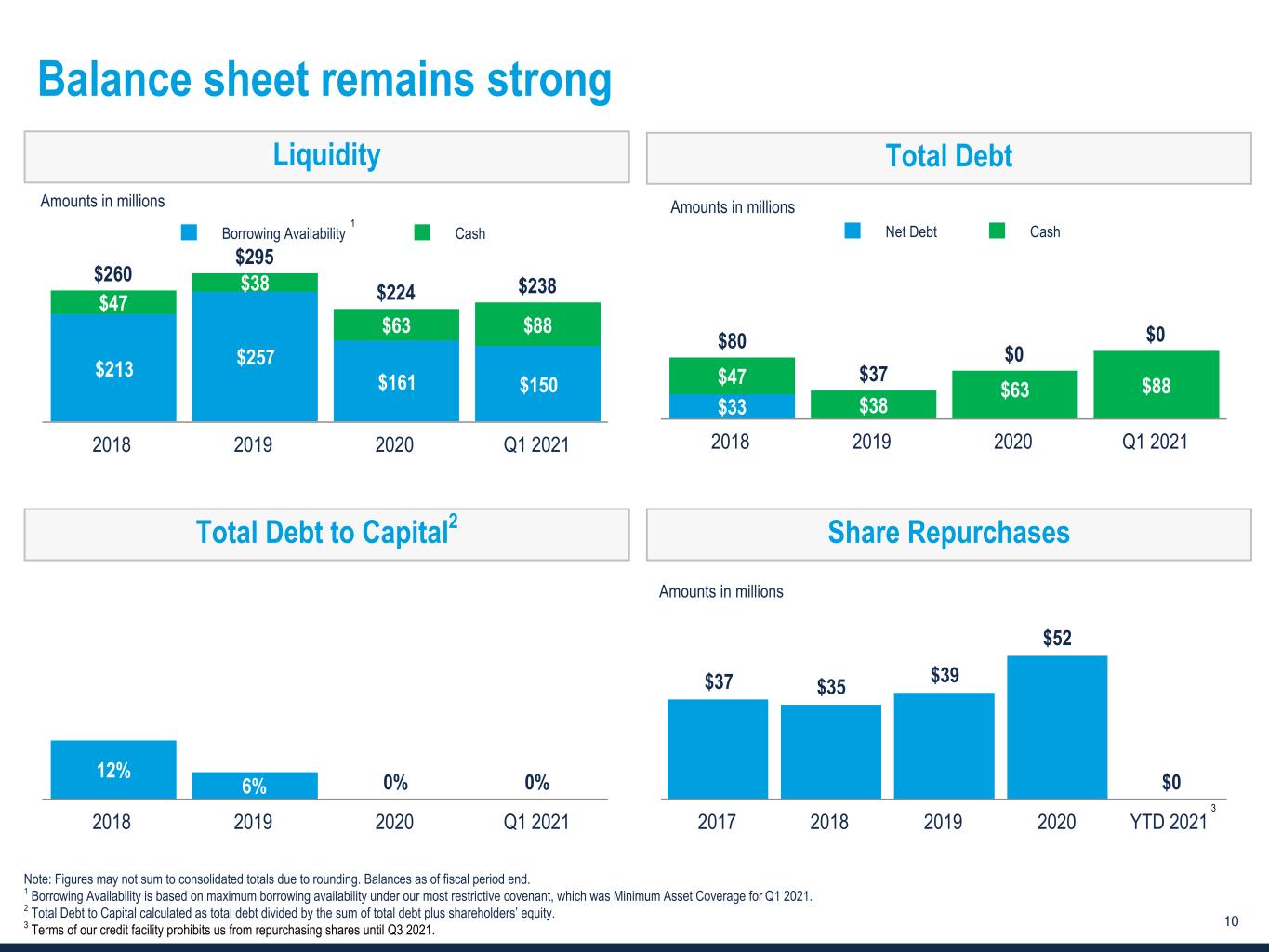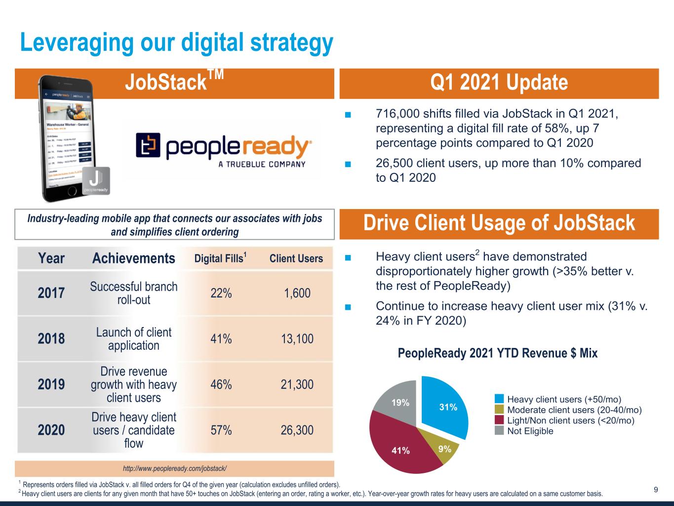 www.TrueBlue.c om 9 Leveraging our digital strategy JobStackTM Q1 2021 Update ■ 716,000 shifts filled via JobStack in Q1 2021, representing a digital fill rate of 58%, up 7 percentage points compared to Q1 2020 ■ 26,500 client users, up more than 10% compared to Q1 2020 ■ Heavy client users2 have demonstrated disproportionately higher growth (>35% better v. the rest of PeopleReady) ■ Continue to increase heavy client user mix (31% v. 24% in FY 2020) Year Achievements Digital Fills1 Client Users 2017 Successful branch roll-out 22% 1,600 2018 Launch of client application 41% 13,100 2019 Drive revenue growth with heavy client users 46% 21,300 2020 Drive heavy client users / candidate flow 57% 26,300 Industry-leading mobile app that connects our associates with jobs and simplifies client ordering http://www.peopleready.com/jobstack/ 1 Represents orders filled via JobStack v. all filled orders for Q4 of the given year (calculation excludes unfilled orders). 2 Heavy client users are clients for any given month that have 50+ touches on JobStack (entering an order, rating a worker, etc.). Year-over-year growth rates for heavy users are calculated on a same customer basis. PeopleReady 2021 YTD Revenue $ Mix 31% 9%41% 19% Heavy client users (+50/mo) Moderate client users (20-40/mo) Light/Non client users (<20/mo) Not Eligible Drive Client Usage of JobStack