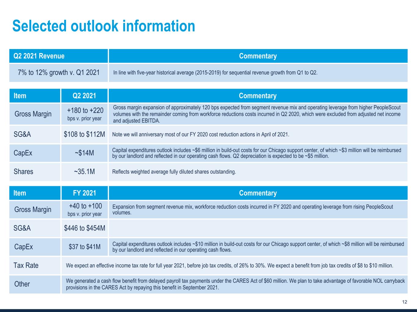 www.TrueBlue.c om 12 Selected outlook information Item Q2 2021 Commentary Gross Margin +180 to +220 bps v. prior year Gross margin expansion of approximately 120 bps expected from segment revenue mix and operating leverage from higher PeopleScout volumes with the remainder coming from workforce reductions costs incurred in Q2 2020, which were excluded from adjusted net income and adjusted EBITDA. SG&A $108 to $112M Note we will anniversary most of our FY 2020 cost reduction actions in April of 2021. CapEx ~$14M Capital expenditures outlook includes ~$6 million in build-out costs for our Chicago support center, of which ~$3 million will be reimbursed by our landlord and reflected in our operating cash flows. Q2 depreciation is expected to be ~$5 million. Shares ~35.1M Reflects weighted average fully diluted shares outstanding. Item FY 2021 Commentary Gross Margin +40 to +100 bps v. prior year Expansion from segment revenue mix, workforce reduction costs incurred in FY 2020 and operating leverage from rising PeopleScout volumes. SG&A $446 to $454M CapEx $37 to $41M Capital expenditures outlook includes ~$10 million in build-out costs for our Chicago support center, of which ~$8 million will be reimbursed by our landlord and reflected in our operating cash flows. Tax Rate We expect an effective income tax rate for full year 2021, before job tax credits, of 26% to 30%. We expect a benefit from job tax credits of $8 to $10 million. Other We generated a cash flow benefit from delayed payroll tax payments under the CARES Act of $60 million. We plan to take advantage of favorable NOL carryback provisions in the CARES Act by repaying this benefit in September 2021. Q2 2021 Revenue Commentary 7% to 12% growth v. Q1 2021 In line with five-year historical average (2015-2019) for sequential revenue growth from Q1 to Q2.