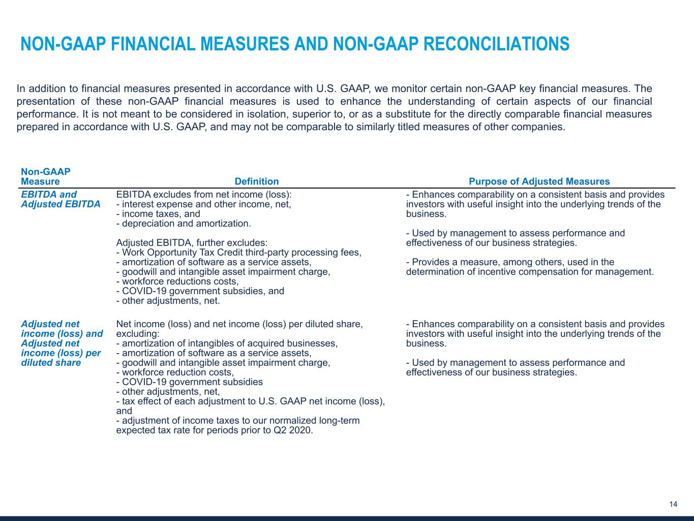 www.TrueBlue.c om 14 NON-GAAP FINANCIAL MEASURES AND NON-GAAP RECONCILIATIONS In addition to financial measures presented in accordance with U.S. GAAP, we monitor certain non-GAAP key financial measures. The presentation of these non-GAAP financial measures is used to enhance the understanding of certain aspects of our financial performance. It is not meant to be considered in isolation, superior to, or as a substitute for the directly comparable financial measures prepared in accordance with U.S. GAAP, and may not be comparable to similarly titled measures of other companies. Non-GAAP Measure Definition Purpose of Adjusted Measures EBITDA and Adjusted EBITDA EBITDA excludes from net income (loss): - interest expense and other income, net, - income taxes, and - depreciation and amortization. Adjusted EBITDA, further excludes: - Work Opportunity Tax Credit third-party processing fees, - amortization of software as a service assets, - goodwill and intangible asset impairment charge, - workforce reductions costs, - COVID-19 government subsidies, and - other adjustments, net. - Enhances comparability on a consistent basis and provides investors with useful insight into the underlying trends of the business. - Used by management to assess performance and effectiveness of our business strategies. - Provides a measure, among others, used in the determination of incentive compensation for management. Adjusted net income (loss) and Adjusted net income (loss) per diluted share Net income (loss) and net income (loss) per diluted share, excluding: - amortization of intangibles of acquired businesses, - amortization of software as a service assets, - goodwill and intangible asset impairment charge, - workforce reduction costs, - COVID-19 government subsidies - other adjustments, net, - tax effect of each adjustment to U.S. GAAP net income (loss), and - adjustment of income taxes to our normalized long-term expected tax rate for periods prior to Q2 2020. - Enhances comparability on a consistent basis and provides investors with useful insight into the underlying trends of the business. - Used by management to assess performance and effectiveness of our business strategies.