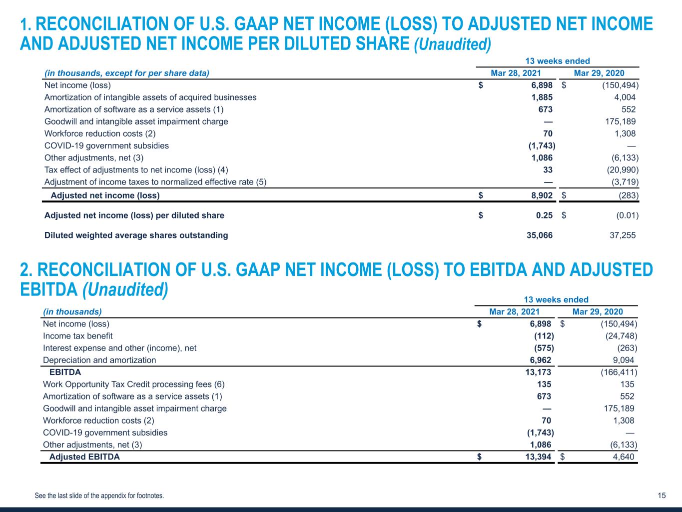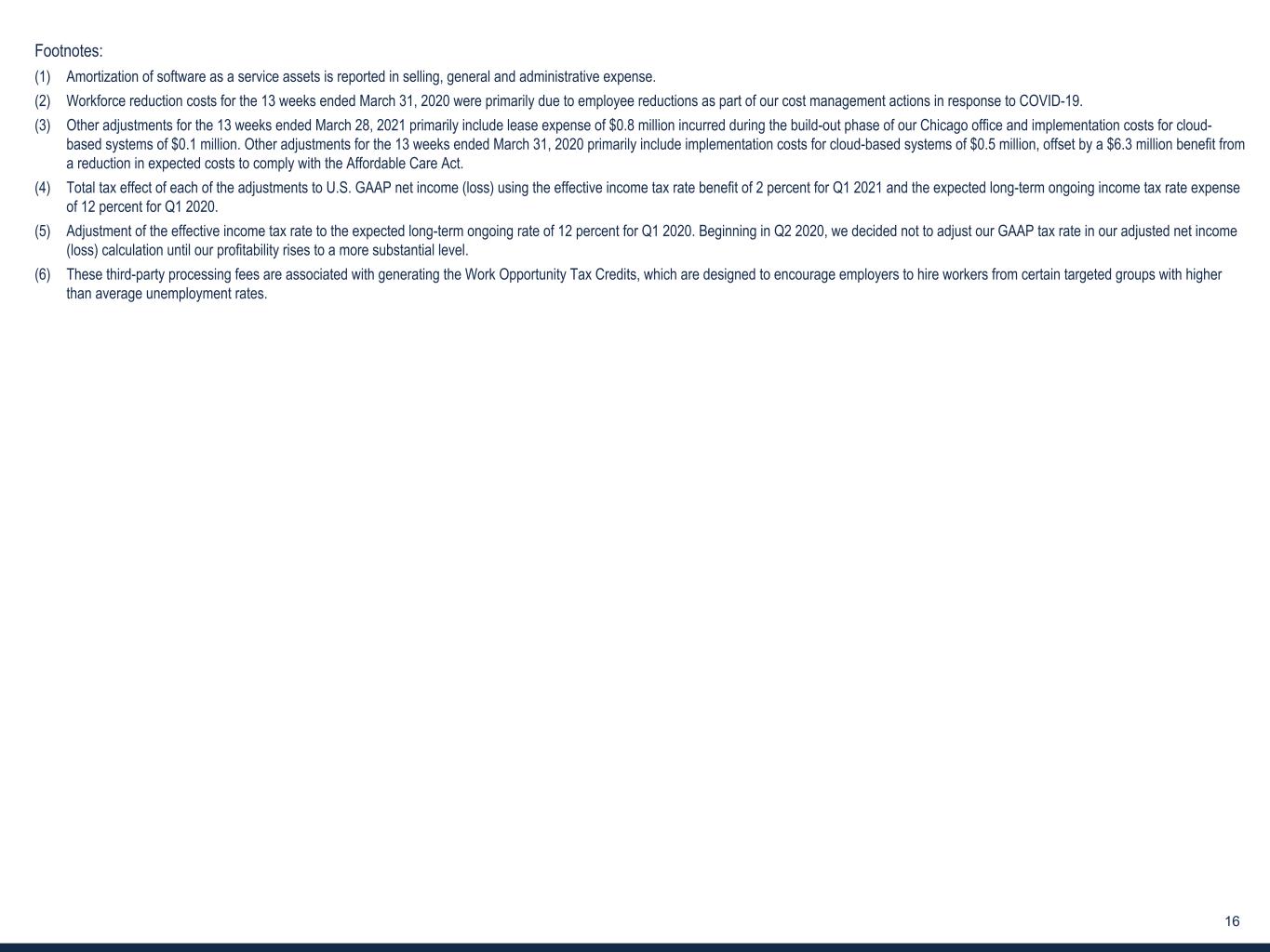 www.TrueBlue.c om 15 1. RECONCILIATION OF U.S. GAAP NET INCOME (LOSS) TO ADJUSTED NET INCOME AND ADJUSTED NET INCOME PER DILUTED SHARE (Unaudited) 13 weeks ended (in thousands, except for per share data) Mar 28, 2021 Mar 29, 2020 Net income (loss) $ 6,898 $ (150,494) Amortization of intangible assets of acquired businesses 1,885 4,004 Amortization of software as a service assets (1) 673 552 Goodwill and intangible asset impairment charge — 175,189 Workforce reduction costs (2) 70 1,308 COVID-19 government subsidies (1,743) — Other adjustments, net (3) 1,086 (6,133) Tax effect of adjustments to net income (loss) (4) 33 (20,990) Adjustment of income taxes to normalized effective rate (5) — (3,719) Adjusted net income (loss) $ 8,902 $ (283) Adjusted net income (loss) per diluted share $ 0.25 $ (0.01) Diluted weighted average shares outstanding 35,066 37,255 See the last slide of the appendix for footnotes. 2. RECONCILIATION OF U.S. GAAP NET INCOME (LOSS) TO EBITDA AND ADJUSTED EBITDA (Unaudited) 13 weeks ended (in thousands) Mar 28, 2021 Mar 29, 2020 Net income (loss) $ 6,898 $ (150,494) Income tax benefit (112) (24,748) Interest expense and other (income), net (575) (263) Depreciation and amortization 6,962 9,094 EBITDA 13,173 (166,411) Work Opportunity Tax Credit processing fees (6) 135 135 Amortization of software as a service assets (1) 673 552 Goodwill and intangible asset impairment charge — 175,189 Workforce reduction costs (2) 70 1,308 COVID-19 government subsidies (1,743) — Other adjustments, net (3) 1,086 (6,133) Adjusted EBITDA $ 13,394 $ 4,640