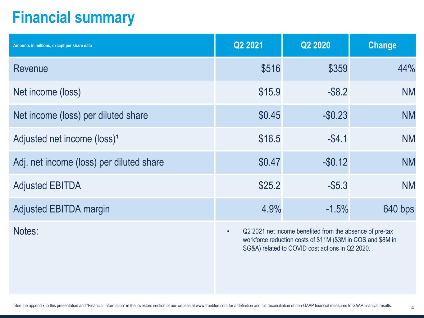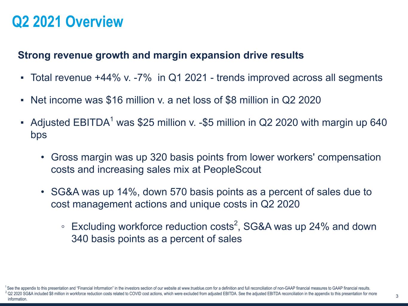 www.TrueBlue.c om 2 Forward-looking statements This document contains forward-looking statements relating to our plans and expectations, all of which are subject to risks and uncertainties. Such statements are based on management’s expectations and assumptions as of the date of this release and involve many risks and uncertainties that could cause actual results to differ materially from those expressed or implied in our forward-looking statements including: (1) national and global economic conditions, (2) the continued impact of COVID-19 and related economic impact and governmental response, (3) our ability to access sufficient capital to finance our operations, including our ability to comply with covenants contained in our revolving credit facility, (4) our ability to attract and retain clients, (5) our ability to attract sufficient qualified candidates and employees to meet the needs of our clients, (6) our ability to maintain profit margins, (7) new laws, regulations, and government incentives that could affect our operations or financial results, (8) our ability to successfully execute on business strategies to further digitalize our business model, and (9) any reduction or change in tax credits we utilize, including the Work Opportunity Tax Credit. Other information regarding factors that could affect our results is included in our Securities Exchange Commission (SEC) filings, including the company’s most recent reports on Forms 10-K and 10-Q, copies of which may be obtained by visiting our website at www.trueblue.com under the Investor Relations section or the SEC’s website at www.sec.gov. We assume no obligation to update or revise any forward-looking statement, whether as a result of new information, future events, or otherwise, except as required by law. Any other references to future financial estimates are included for informational purposes only and subject to risk factors discussed in our most recent filings with the SEC. In addition, we use several non-GAAP financial measures when presenting our financial results in this document. Please refer to the reconciliations between our GAAP and non-GAAP financial measures in the appendix to this presentation and on our website at www.trueblue.com under the Investor Relations section for additional information on both current and historical periods. The presentation of these non-GAAP financial measures is used to enhance the understanding of certain aspects of our financial performance. It is not meant to be considered in isolation, superior to, or as a substitute for the directly comparable financial measures prepared in accordance with U.S. GAAP, and may not be comparable to similarly titled measures of other companies. Any comparisons made herein to other periods are based on a comparison to the same period in the prior year unless otherwise stated.