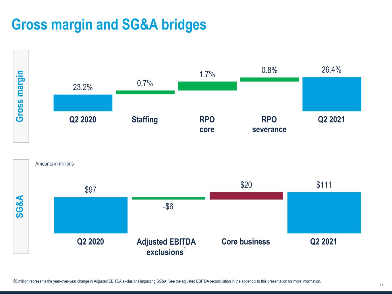 www.TrueBlue.c om 4 Financial summary 1 See the appendix to this presentation and “Financial Information” in the investors section of our website at www.trueblue.com for a definition and full reconciliation of non-GAAP financial measures to GAAP financial results. Amounts in millions, except per share data Q2 2021 Q2 2020 Change Revenue $516 $359 44 % Net income (loss) $15.9 -$8.2 NM Net income (loss) per diluted share $0.45 -$0.23 NM Adjusted net income (loss)¹ $16.5 -$4.1 NM Adj. net income (loss) per diluted share $0.47 -$0.12 NM Adjusted EBITDA $25.2 -$5.3 NM Adjusted EBITDA margin 4.9 % -1.5 % 640 bps Notes: ▪ Q2 2021 net income benefited from the absence of pre-tax workforce reduction costs of $11M ($3M in COS and $8M in SG&A) related to COVID cost actions in Q2 2020.