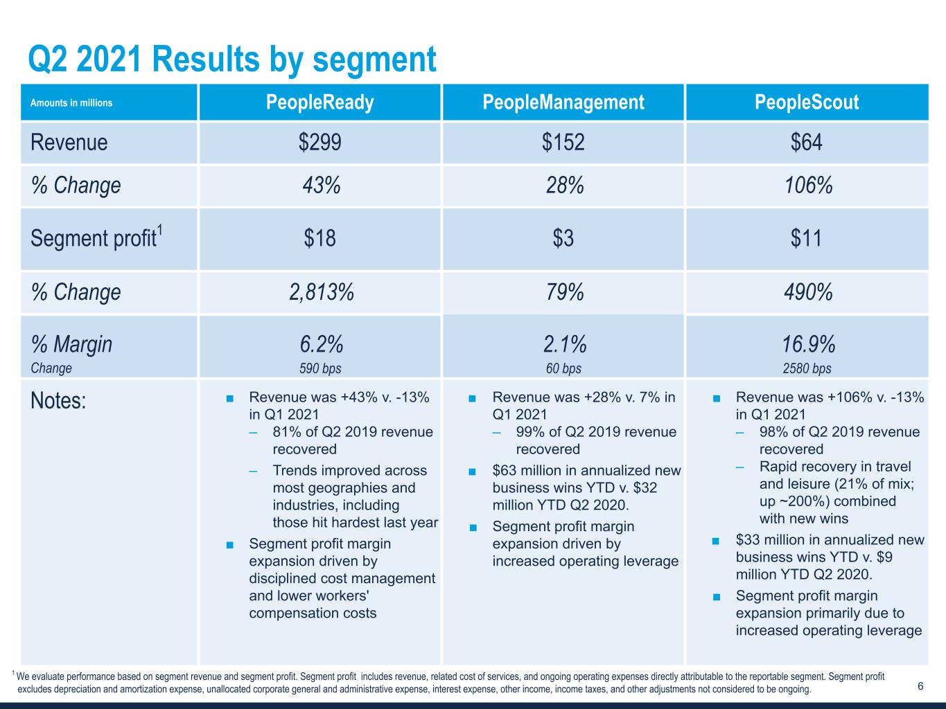 www.TrueBlue.c om 5 Gross margin and SG&A bridges Amounts in millions Gr os s m ar gi n SG &A $97 -$6 $20 $111 Q2 2020 Core business Q2 2021 23.2% 0.7% 1.7% 0.8% 26.4% Q2 2020 Staffing RPO core RPO severance Q2 2021 Adjusted EBITDA exclusions1 1 $6 million represents the year-over-year change in Adjusted EBITDA exclusions impacting SG&A. See the adjusted EBITDA reconciliation in the appendix to this presentation for more information.