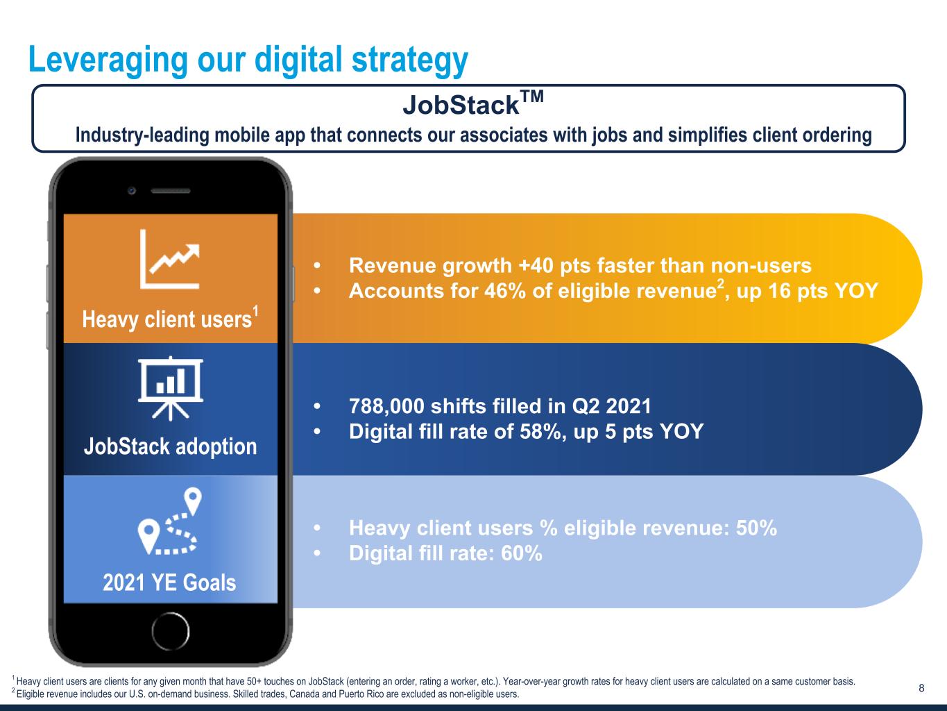 www.TrueBlue.c om 7 Strategy highlights Lev rage technology and our industry leading position to grow market share and enhance efficiency ▪ Focus sales and marketing efforts to capitalize on industry dynamics (i.e. outsourcing) and hard-hit sectors entering recovery (i.e. travel & leisure) ▪ Leverage our strong brand; independently ranked as a market leader ▪ Expand technology offering to improve client delivery and recruiting efficiency ▪ Digitalize our business model to gain market share from smaller and less well-capitalized competitors and reduce costs ▪ Drive higher client usage ("heavy client users") of JobStackTM, our industry- leading technology, to accelerate revenue improvement ▪ Increase candidate flow and quality using new digital onboarding platforms ▪ Continue momentum on new customer wins through strong execution of sales initiatives ▪ Increase sales resources to expand into under- penetrated geographic markets ▪ Invest in client and associate care in addition to retention programs