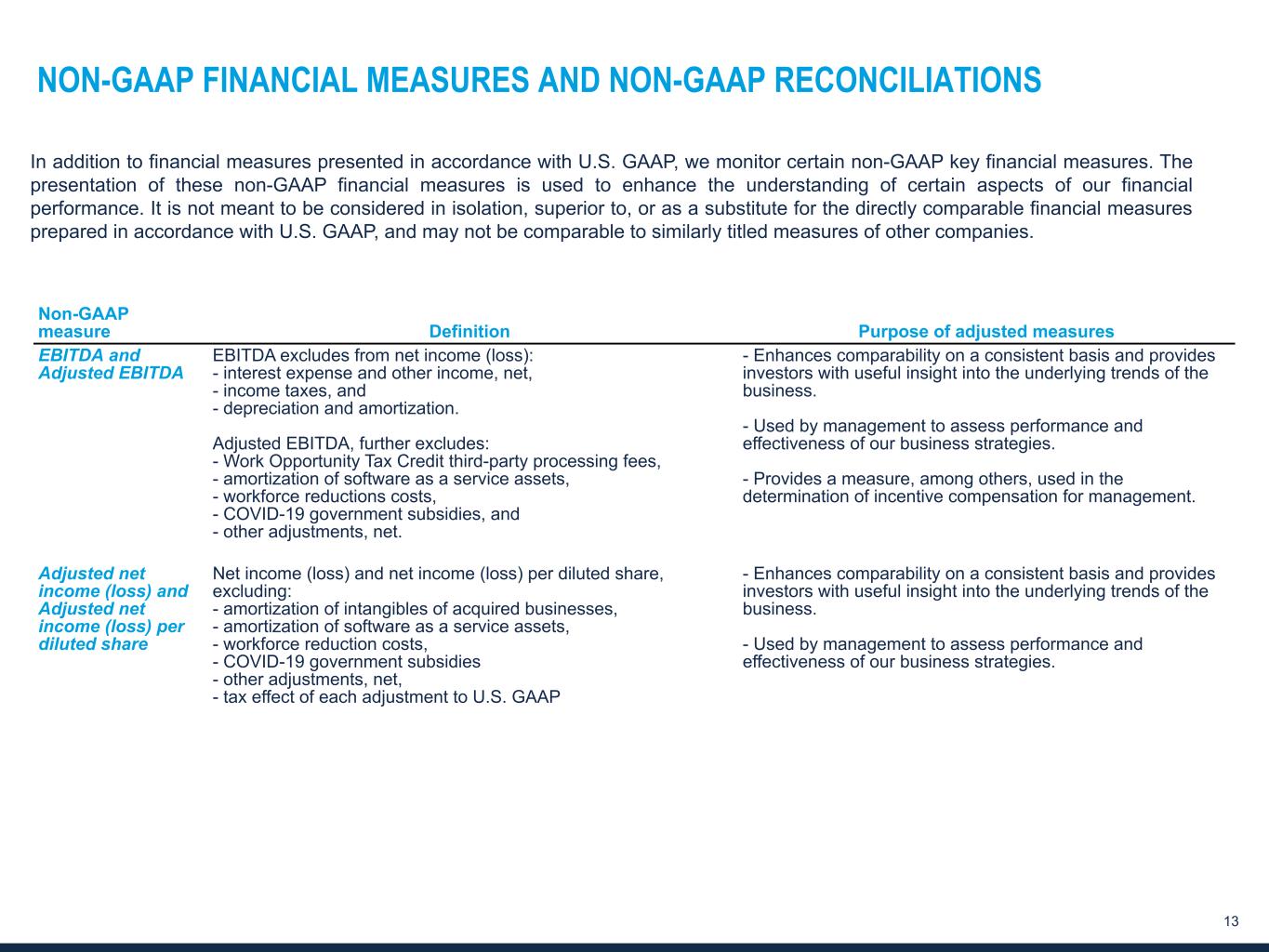 www.TrueBlue.c om 13 NON-GAAP FINANCIAL MEASURES AND NON-GAAP RECONCILIATIONS In addition to financial measures presented in accordance with U.S. GAAP, we monitor certain non-GAAP key financial measures. The presentation of these non-GAAP financial measures is used to enhance the understanding of certain aspects of our financial performance. It is not meant to be considered in isolation, superior to, or as a substitute for the directly comparable financial measures prepared in accordance with U.S. GAAP, and may not be comparable to similarly titled measures of other companies. Non-GAAP measure Definition Purpose of adjusted measures EBITDA and Adjusted EBITDA EBITDA excludes from net income (loss): - interest expense and other income, net, - income taxes, and - depreciation and amortization. Adjusted EBITDA, further excludes: - Work Opportunity Tax Credit third-party processing fees, - amortization of software as a service assets, - workforce reductions costs, - COVID-19 government subsidies, and - other adjustments, net. - Enhances comparability on a consistent basis and provides investors with useful insight into the underlying trends of the business. - Used by management to assess performance and effectiveness of our business strategies. - Provides a measure, among others, used in the determination of incentive compensation for management. Adjusted net income (loss) and Adjusted net income (loss) per diluted share Net income (loss) and net income (loss) per diluted share, excluding: - amortization of intangibles of acquired businesses, - amortization of software as a service assets, - workforce reduction costs, - COVID-19 government subsidies - other adjustments, net, - tax effect of each adjustment to U.S. GAAP - Enhances comparability on a consistent basis and provides investors with useful insight into the underlying trends of the business. - Used by management to assess performance and effectiveness of our business strategies.
