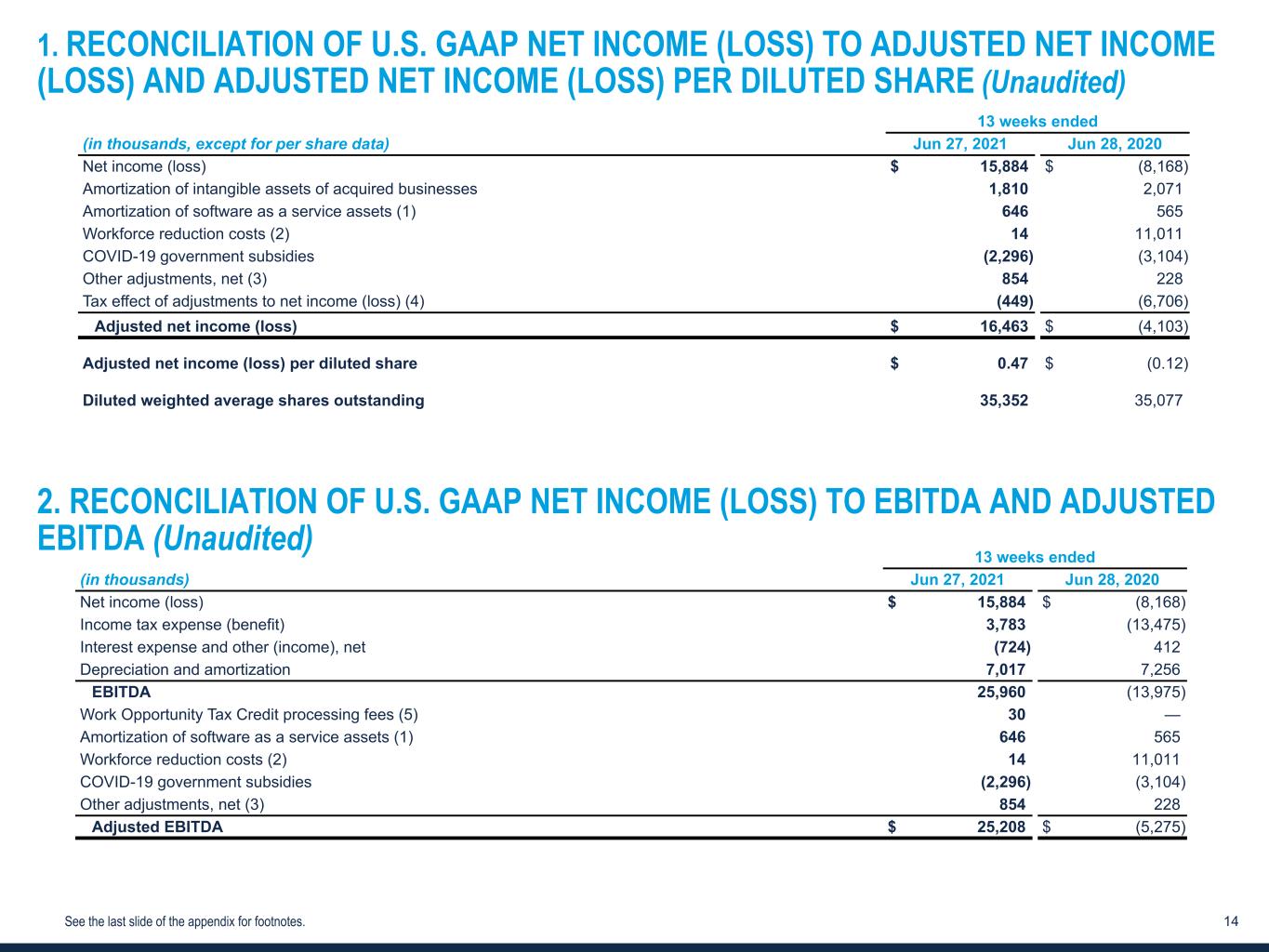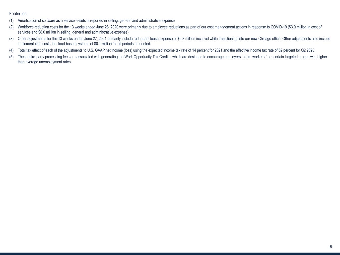 www.TrueBlue.c om 14 1. RECONCILIATION OF U.S. GAAP NET INCOME (LOSS) TO ADJUSTED NET INCOME (LOSS) AND ADJUSTED NET INCOME (LOSS) PER DILUTED SHARE (Unaudited) 13 weeks ended (in thousands, except for per share data) Jun 27, 2021 Jun 28, 2020 Net income (loss) $ 15,884 $ (8,168) Amortization of intangible assets of acquired businesses 1,810 2,071 Amortization of software as a service assets (1) 646 565 Workforce reduction costs (2) 14 11,011 COVID-19 government subsidies (2,296) (3,104) Other adjustments, net (3) 854 228 Tax effect of adjustments to net income (loss) (4) (449) (6,706) Adjusted net income (loss) $ 16,463 $ (4,103) Adjusted net income (loss) per diluted share $ 0.47 $ (0.12) Diluted weighted average shares outstanding 35,352 35,077 See the last slide of the appendix for footnotes. 2. RECONCILIATION OF U.S. GAAP NET INCOME (LOSS) TO EBITDA AND ADJUSTED EBITDA (Unaudited) 13 weeks ended (in thousands) Jun 27, 2021 Jun 28, 2020 Net income (loss) $ 15,884 $ (8,168) Income tax expense (benefit) 3,783 (13,475) Interest expense and other (income), net (724) 412 Depreciation and amortization 7,017 7,256 EBITDA 25,960 (13,975) Work Opportunity Tax Credit processing fees (5) 30 — Amortization of software as a service assets (1) 646 565 Workforce reduction costs (2) 14 11,011 COVID-19 government subsidies (2,296) (3,104) Other adjustments, net (3) 854 228 Adjusted EBITDA $ 25,208 $ (5,275)