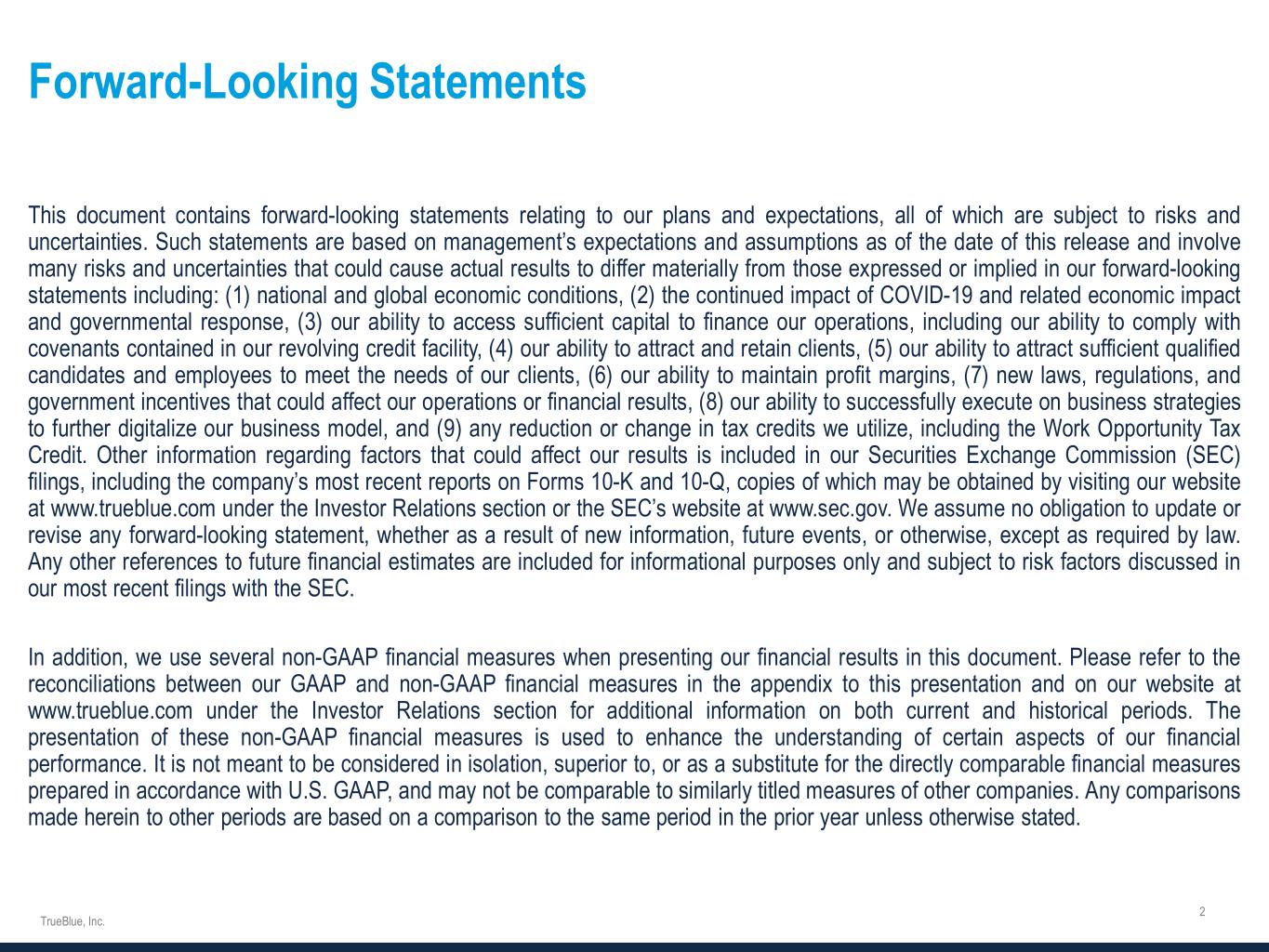 Forward-Looking Statements This document contains forward-looking statements relating to our plans and expectations, all of which are subject to risks and uncertainties. Such statements are based on management’s expectations and assumptions as of the date of this release and involve many risks and uncertainties that could cause actual results to differ materially from those expressed or implied in our forward-looking statements including: (1) national and global economic conditions, (2) the continued impact of COVID-19 and related economic impact and governmental response, (3) our ability to access sufficient capital to finance our operations, including our ability to comply with covenants contained in our revolving credit facility, (4) our ability to attract and retain clients, (5) our ability to attract sufficient qualified candidates and employees to meet the needs of our clients, (6) our ability to maintain profit margins, (7) new laws, regulations, and government incentives that could affect our operations or financial results, (8) our ability to successfully execute on business strategies to further digitalize our business model, and (9) any reduction or change in tax credits we utilize, including the Work Opportunity Tax Credit. Other information regarding factors that could affect our results is included in our Securities Exchange Commission (SEC) filings, including the company’s most recent reports on Forms 10-K and 10-Q, copies of which may be obtained by visiting our website at www.trueblue.com under the Investor Relations section or the SEC’s website at www.sec.gov. We assume no obligation to update or revise any forward-looking statement, whether as a result of new information, future events, or otherwise, except as required by law. Any other references to future financial estimates are included for informational purposes only and subject to risk factors discussed in our most recent filings with the SEC. In addition, we use several non-GAAP financial measures when presenting our financial results in this document. Please refer to the reconciliations between our GAAP and non-GAAP financial measures in the appendix to this presentation and on our website at www.trueblue.com under the Investor Relations section for additional information on both current and historical periods. The presentation of these non-GAAP financial measures is used to enhance the understanding of certain aspects of our financial performance. It is not meant to be considered in isolation, superior to, or as a substitute for the directly comparable financial measures prepared in accordance with U.S. GAAP, and may not be comparable to similarly titled measures of other companies. Any comparisons made herein to other periods are based on a comparison to the same period in the prior year unless otherwise stated.