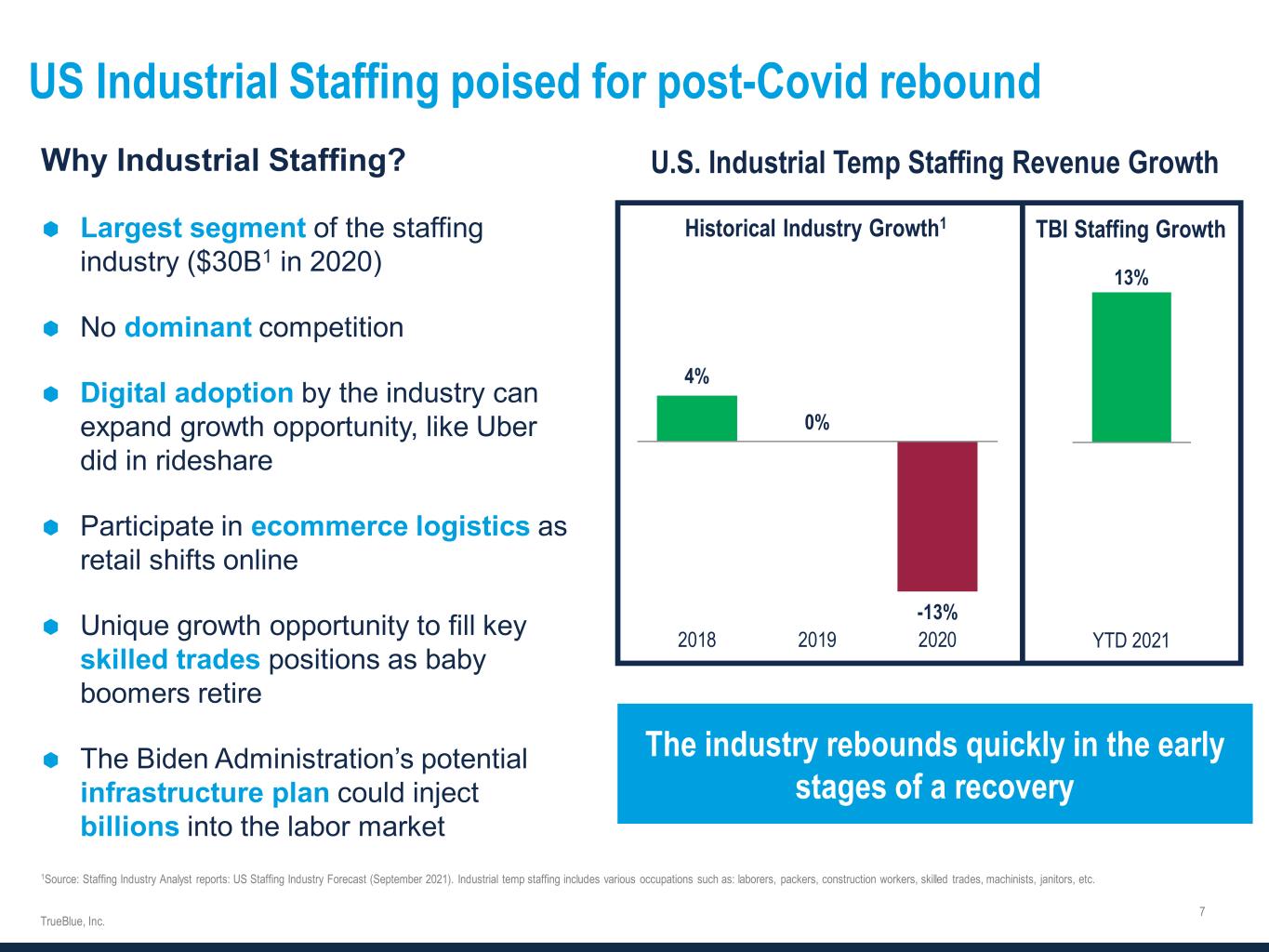 US Industrial Staffing poised for post-Covid rebound Why Industrial Staffing? Largest segment of the staffing industry ($30B1 in 2020) No dominant competition Digital adoption by the industry can expand growth opportunity, like Uber did in rideshare Participate in ecommerce logistics as retail shifts online Unique growth opportunity to fill key skilled trades positions as baby boomers retire The Biden Administration’s potential infrastructure plan could inject billions into the labor market 1Source: Staffing Industry Analyst reports: US Staffing Industry Forecast (September 2021). Industrial temp staffing includes various occupations such as: laborers, packers, construction workers, skilled trades, machinists, janitors, etc. U.S. Industrial Temp Staffing Revenue Growth 4% 0% -13% 2018 2019 2020 Historical Industry Growth1 The industry rebounds quickly in the early stages of a recovery 13% YTD 2021 TBI Staffing Growth