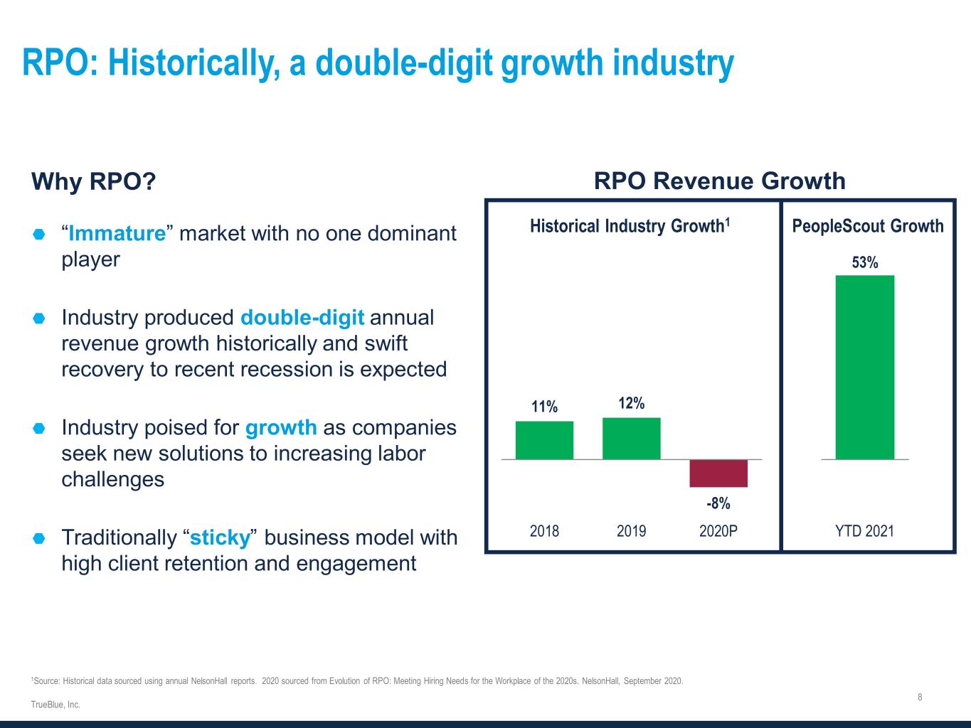 RPO: Historically, a double-digit growth industry Why RPO? “Immature” market with no one dominant player Industry produced double-digit annual revenue growth historically and swift recovery to recent recession is expected Industry poised for growth as companies seek new solutions to increasing labor challenges Traditionally “sticky” business model with high client retention and engagement 1Source: Historical data sourced using annual NelsonHall reports. 2020 sourced from Evolution of RPO: Meeting Hiring Needs for the Workplace of the 2020s. NelsonHall, September 2020. 11% 12% -8% 2018 2019 2020P RPO Revenue Growth Historical Industry Growth1 PeopleScout Growth 53% YTD 2021