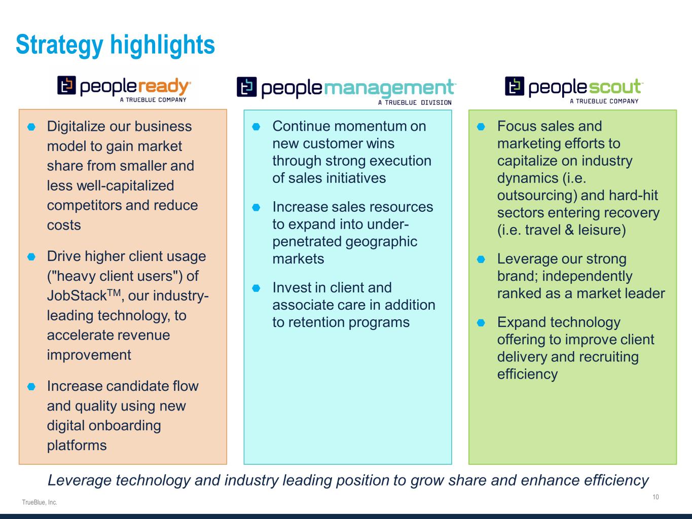 Leverage technology and industry leading position to grow share and enhance efficiency Strategy highlights Digitalize our business model to gain market share from smaller and less well-capitalized competitors and reduce costs Drive higher client usage ("heavy client users") of JobStackTM, our industry- leading technology, to accelerate revenue improvement Increase candidate flow and quality using new digital onboarding platforms Continue momentum on new customer wins through strong execution of sales initiatives Increase sales resources to expand into under- penetrated geographic markets Invest in client and associate care in addition to retention programs Focus sales and marketing efforts to capitalize on industry dynamics (i.e. outsourcing) and hard-hit sectors entering recovery (i.e. travel & leisure) Leverage our strong brand; independently ranked as a market leader Expand technology offering to improve client delivery and recruiting efficiency