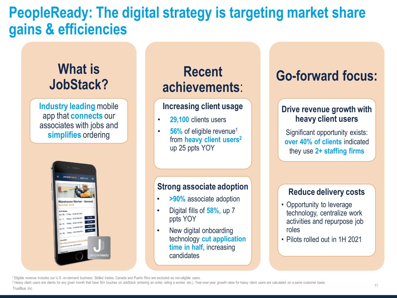PeopleReady: The digital strategy is targeting market share gains & efficiencies What is JobStack? Industry leading mobile app that connects our associates with jobs and simplifies ordering Recent achievements: Strong associate adoption • >90% associate adoption • Digital fills of 58%, up 7 ppts YOY • New digital onboarding technology cut application time in half, increasing candidates Go-forward focus: Drive revenue growth with heavy client users Significant opportunity exists: over 40% of clients indicated they use 2+ staffing firms Reduce delivery costs • Opportunity to leverage technology, centralize work activities and repurpose job roles • Pilots rolled out in 1H 2021 Increasing client usage • 29,100 clients users • 56% of eligible revenue1 from heavy client users2 up 25 ppts YOY 1 Eligible revenue includes our U.S. on-demand business. Skilled trades, Canada and Puerto Rico are excluded as non-eligible users. 2 Heavy client users are clients for any given month that have 50+ touches on JobStack (entering an order, rating a worker, etc.). Year-over-year growth rates for heavy client users are calculated on a same customer basis.