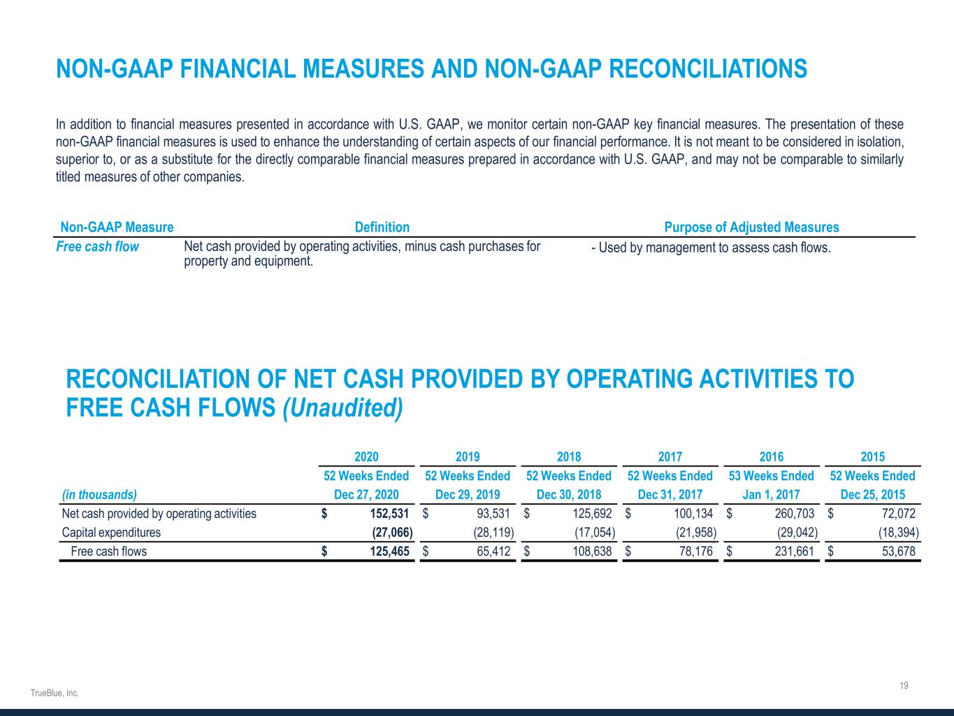 $90 $33 $29 $47 $38 $63 $119 $80 $37 $0 2017 2018 2019 2020 Net Debt Cash $117 $213 $257 $161 $29 $47 $38 $63$146 $260 $295 $224 2017 2018 2019 2020 Borrowing Availability Cash The balance sheet continues to strengthen 1 Borrowing Availability is based on maximum borrowing availability under our most restrictive covenant, which was Minimum Asset Coverage for 2020. 2 Total Debt to Capital calculated as total debt divided by the sum of total debt plus shareholders’ equity. 3 Calculated as net cash provided by operating activities, minus purchases for property and equipment. See the appendix to this presentation and “Financial Information” in the Investors section of our website at www.trueblue.com for a definition and full reconciliation of non-GAAP financial measures to GAAP financial results. 3 Amounts in millions Amounts in millions $232 $78 $109 $65 $125 2016 2017 2018 2019 2020 18% 12% 6% 0% 2017 2018 2019 2020 ¹