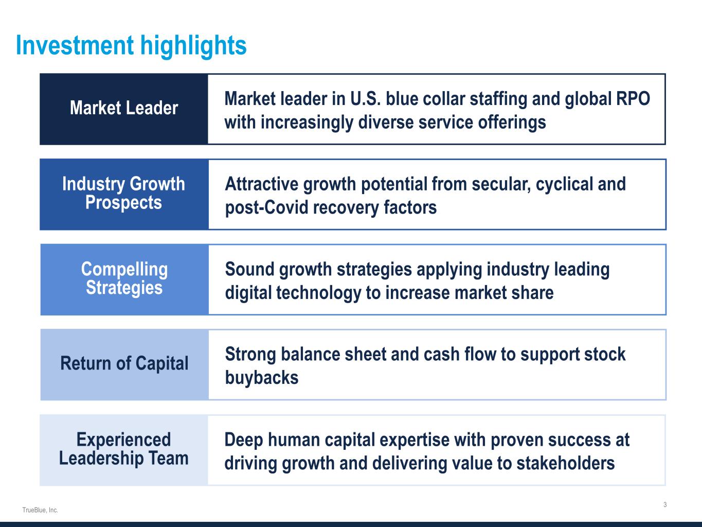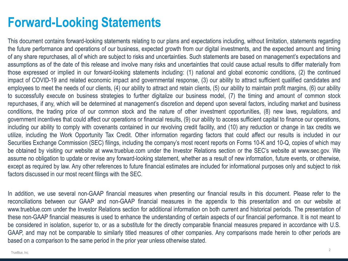 Forward-Looking Statements This document contains forward-looking statements relating to our plans and expectations including, without limitation, statements regarding the future performance and operations of our business, expected growth from our digital investments, and the expected amount and timing of any share repurchases, all of which are subject to risks and uncertainties. Such statements are based on management’s expectations and assumptions as of the date of this release and involve many risks and uncertainties that could cause actual results to differ materially from those expressed or implied in our forward-looking statements including: (1) national and global economic conditions, (2) the continued impact of COVID-19 and related economic impact and governmental response, (3) our ability to attract sufficient qualified candidates and employees to meet the needs of our clients, (4) our ability to attract and retain clients, (5) our ability to maintain profit margins, (6) our ability to successfully execute on business strategies to further digitalize our business model, (7) the timing and amount of common stock repurchases, if any, which will be determined at management’s discretion and depend upon several factors, including market and business conditions, the trading price of our common stock and the nature of other investment opportunities, (8) new laws, regulations, and government incentives that could affect our operations or financial results, (9) our ability to access sufficient capital to finance our operations, including our ability to comply with covenants contained in our revolving credit facility, and (10) any reduction or change in tax credits we utilize, including the Work Opportunity Tax Credit. Other information regarding factors that could affect our results is included in our Securities Exchange Commission (SEC) filings, including the company’s most recent reports on Forms 10-K and 10-Q, copies of which may be obtained by visiting our website at www.trueblue.com under the Investor Relations section or the SEC’s website at www.sec.gov. We assume no obligation to update or revise any forward-looking statement, whether as a result of new information, future events, or otherwise, except as required by law. Any other references to future financial estimates are included for informational purposes only and subject to risk factors discussed in our most recent filings with the SEC. In addition, we use several non-GAAP financial measures when presenting our financial results in this document. Please refer to the reconciliations between our GAAP and non-GAAP financial measures in the appendix to this presentation and on our website at www.trueblue.com under the Investor Relations section for additional information on both current and historical periods. The presentation of these non-GAAP financial measures is used to enhance the understanding of certain aspects of our financial performance. It is not meant to be considered in isolation, superior to, or as a substitute for the directly comparable financial measures prepared in accordance with U.S. GAAP, and may not be comparable to similarly titled measures of other companies. Any comparisons made herein to other periods are based on a comparison to the same period in the prior year unless otherwise stated.