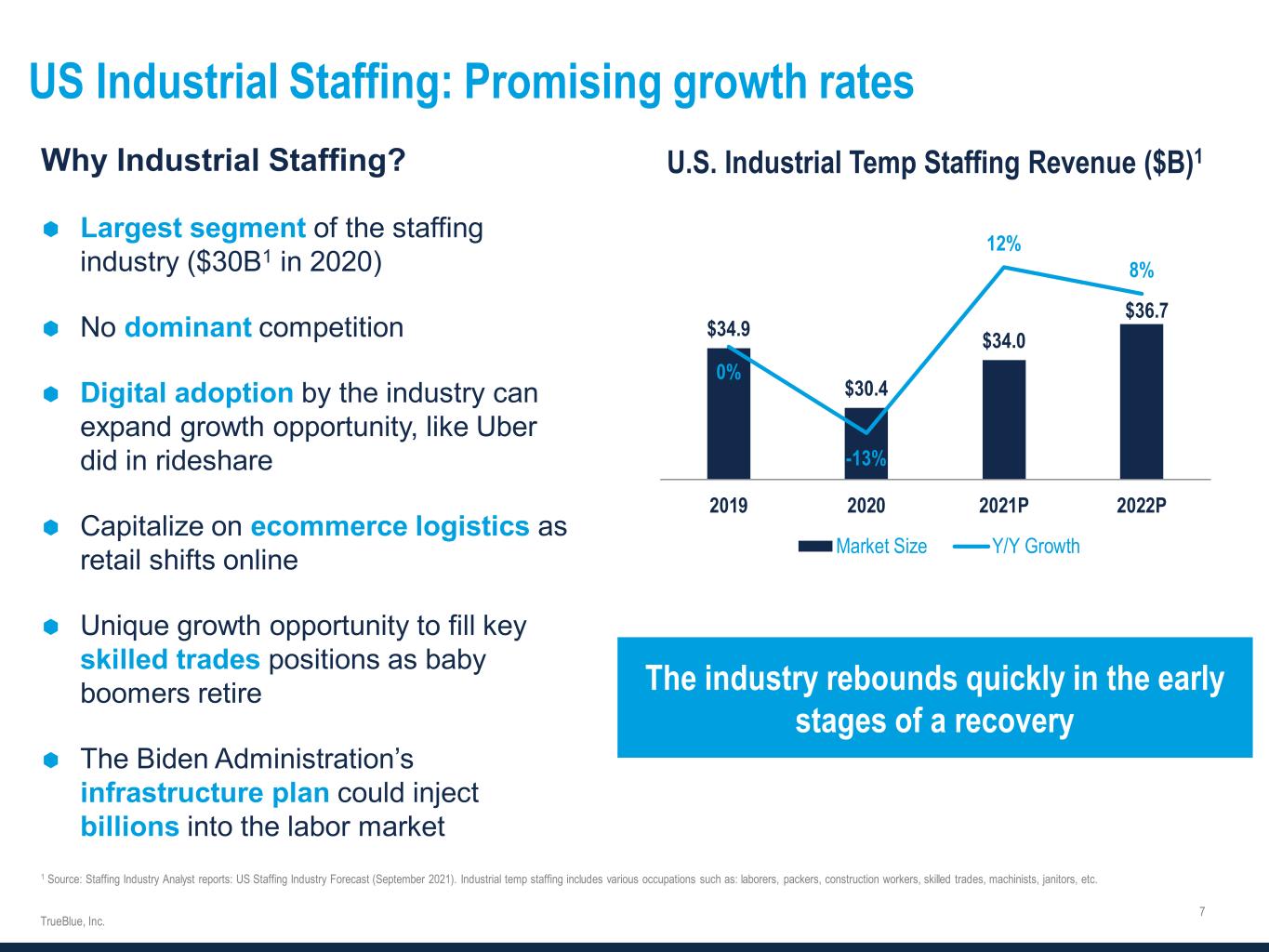 US Industrial Staffing: Promising growth rates Why Industrial Staffing? Largest segment of the staffing industry ($30B1 in 2020) No dominant competition Digital adoption by the industry can expand growth opportunity, like Uber did in rideshare Capitalize on ecommerce logistics as retail shifts online Unique growth opportunity to fill key skilled trades positions as baby boomers retire The Biden Administration’s infrastructure plan could inject billions into the labor market 1 Source: Staffing Industry Analyst reports: US Staffing Industry Forecast (September 2021). Industrial temp staffing includes various occupations such as: laborers, packers, construction workers, skilled trades, machinists, janitors, etc. U.S. Industrial Temp Staffing Revenue ($B)1 The industry rebounds quickly in the early stages of a recovery $34.9 $30.4 $34.0 $36.7 0% -13% 12% 8% -20% -15% -10% -5% 0% 5% 10% 15% 20% 25 27 29 31 33 35 37 39 41 43 45 2019 2020 2021P 2022P Market Size Y/Y Growth