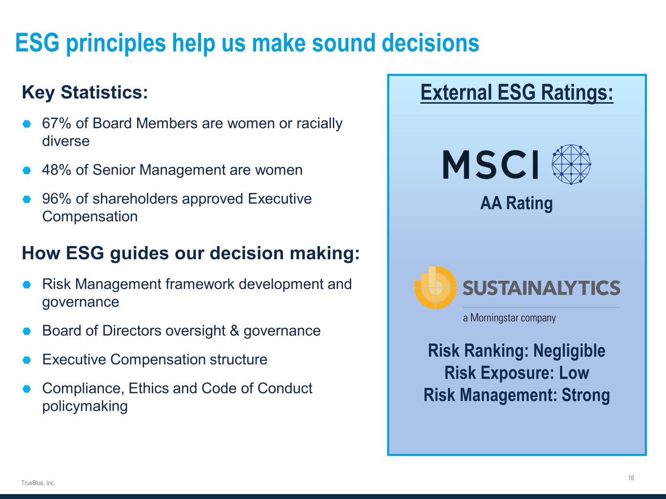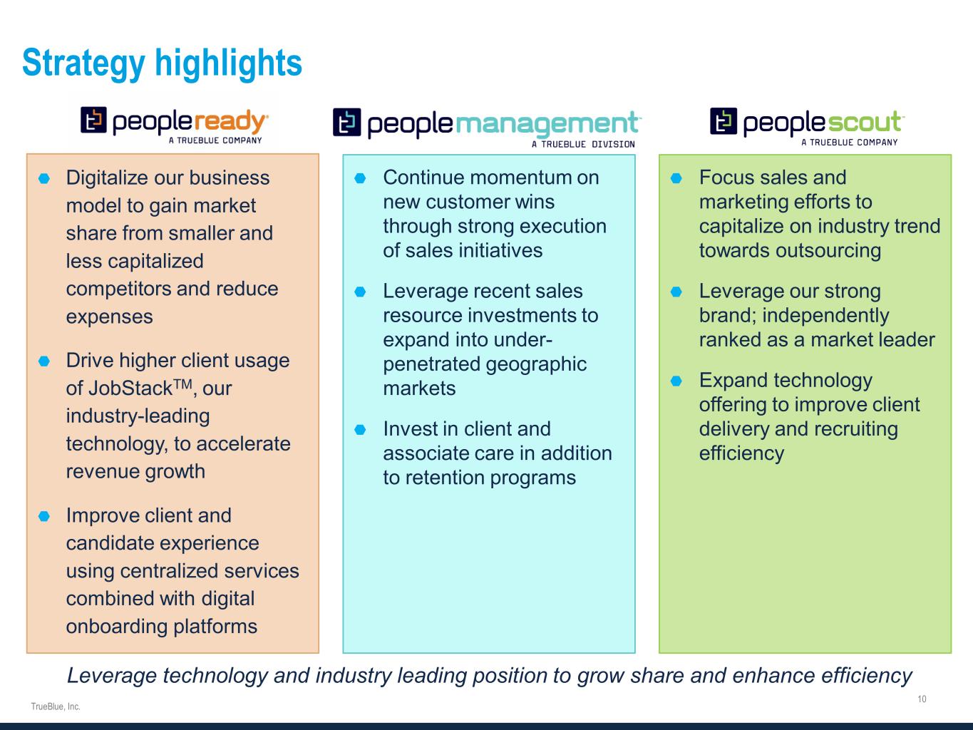 Leadership with deep industry experience A. Patrick Beharelle President and CEO 25+ years of industry experience 10 years of CEO experience TrueBlue CEO since 2018 Derrek Gafford EVP and CFO 20 years of industry experience 18 years of CFO experience TrueBlue CFO since 2006 Taryn Owen President and COO PeopleReady & PeopleScout 20+ years of industry experience 9 years as business leader PeopleReady President since 2019 7 years as PeopleScout President Carl Schweihs President and COO PeopleManagement 9 years of industry experience PeopleManagement President since 2019