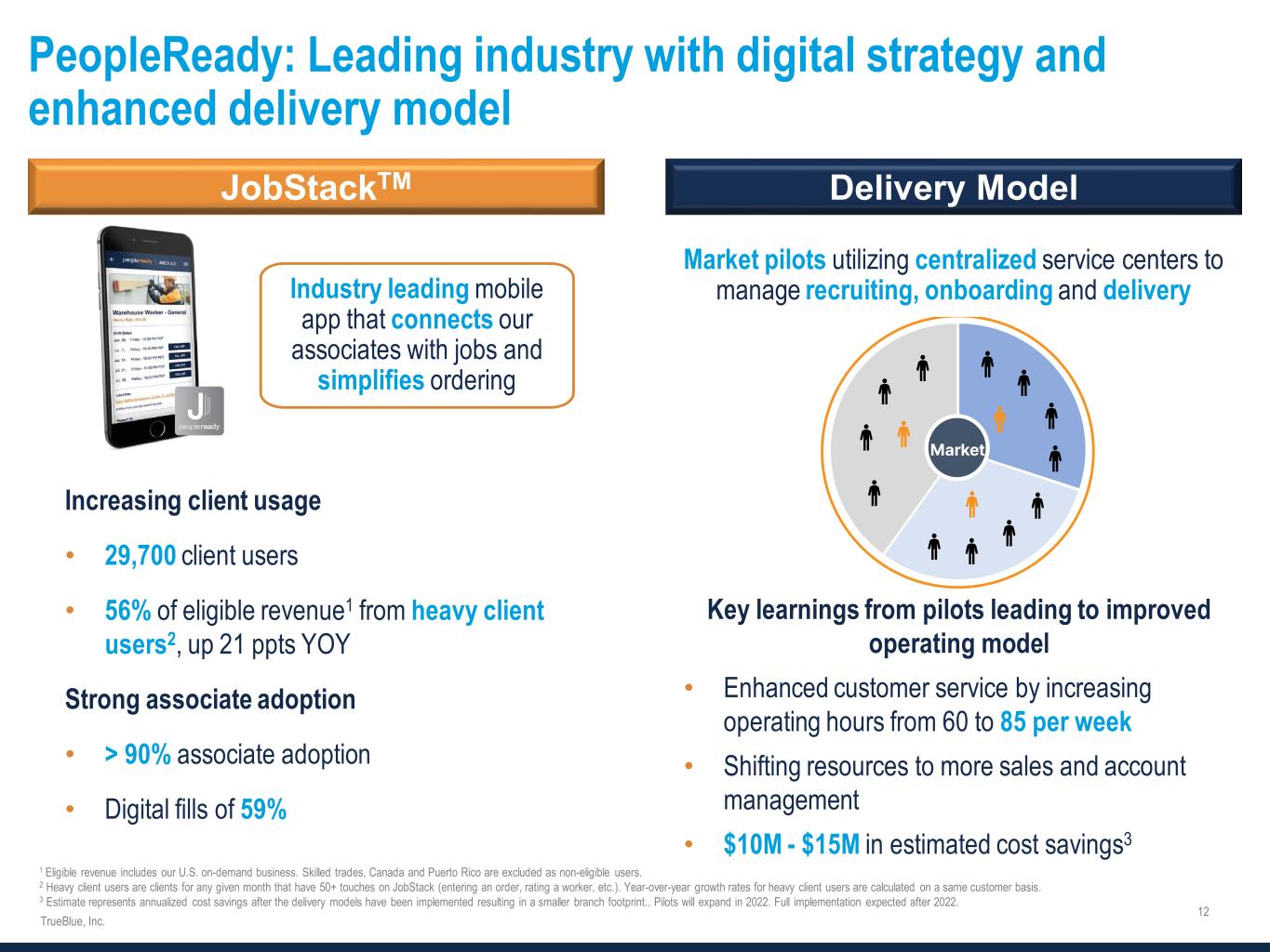 Revenue1 Segment profit mix1 Segment profit margin1 7% 2% 14% Three specialized segments meet diverse client needs On-demand general and skilled labor for industrial jobs Contingent, on-site industrial staffing and commercial driver services Talent solutions for outsourcing the recruiting process for permanent employees 1 Revenue and segment profit calculations based on FY 2021. We evaluate performance based on segment revenue and segment profit. Segment profit includes revenue, related cost of services, and ongoing operating expenses directly attributable to the reportable segment. Segment profit excludes depreciation and amortization expense, unallocated corporate general and administrative expense, interest expense, other income, income taxes, and other adjustments not considered to be ongoing. ² Average, estimated margin associated with additional organic revenue. Refer to “Financial Information” in the investors section of our website at www.trueblue.com for more information regarding non-GAAP terms. PeopleReady PeopleManagement PeopleScout TrueBlue Incremental Segment profit / EBITDA Margin2 15 – 20% 8 – 13% 27 – 32% 15 – 20% 59% 63% 29% 10% 12% 27% PeopleReady PeopleManagement PeopleScout