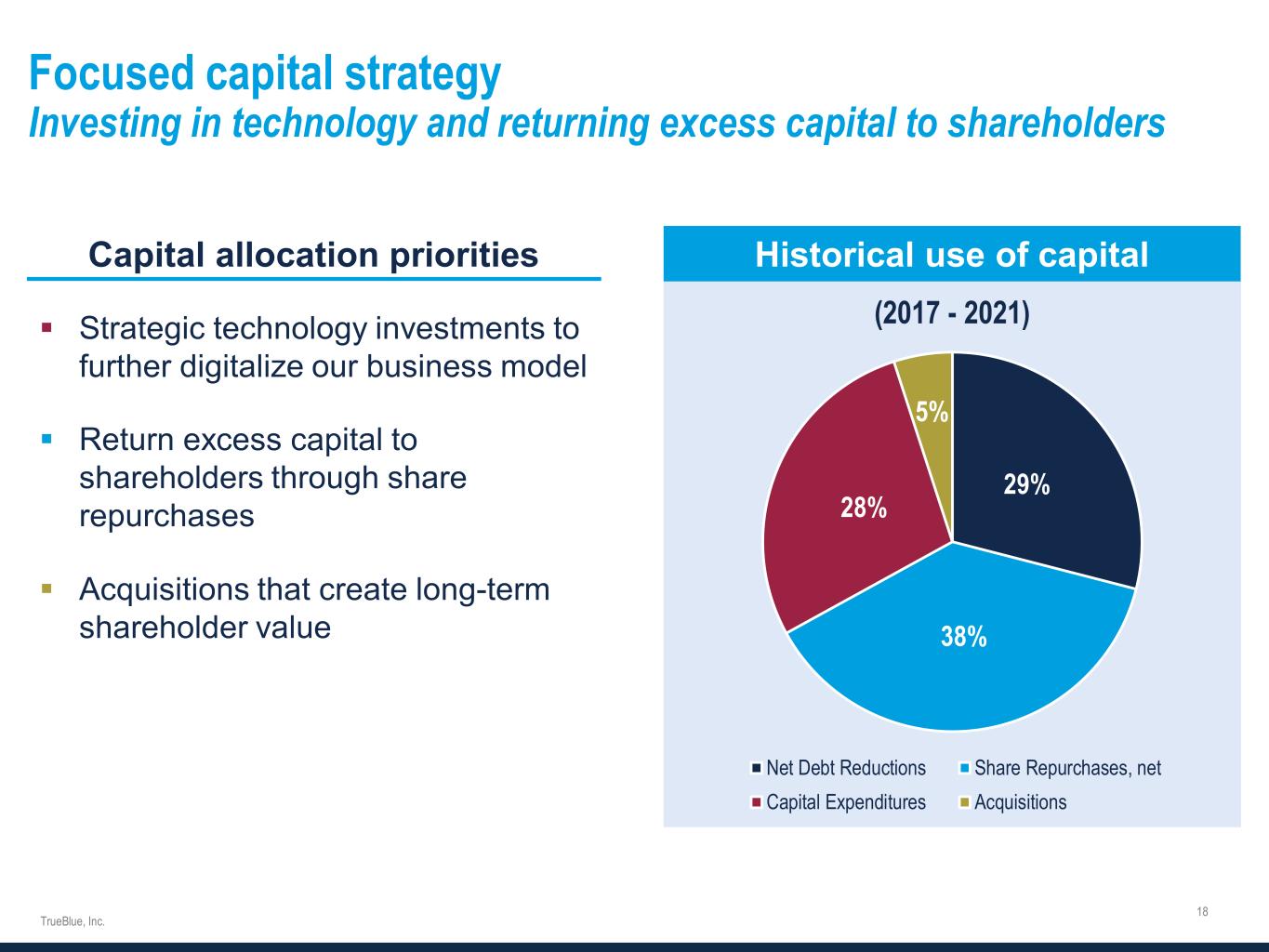 $33 $47 $38 $63 $50 $80 $37 $0 $0 2018 2019 2020 2021 Net Debt Cash $213 $257 $161 $294 $47 $38 $63 $50$260 $295 $224 $344 2018 2019 2020 2021 Borrowing Availability Cash The balance sheet remains strong 1 Total Debt to Capital calculated as total debt divided by the sum of total debt plus shareholders’ equity. 2 Calculated as adjusted net income divided by average shareholders’ equity over the prior four quarters. See the appendix to this presentation and “Financial Information” in the Investors section of our website at www.trueblue.com for a definition and full reconciliation of non-GAAP financial measures to GAAP financial results. 2 Amounts in millions Amounts in millions 13% 16% 13% 4% 15% 2017 2018 2019 2020 2021 12% 6% 0% 0% 2018 2019 2020 2021