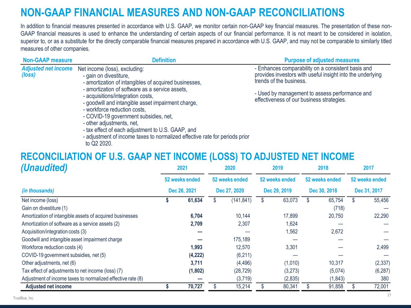 NON-GAAP FINANCIAL MEASURES AND NON-GAAP RECONCILIATIONS In addition to financial measures presented in accordance with U.S. GAAP, we monitor certain non-GAAP key financial measures. The presentation of these non- GAAP financial measures is used to enhance the understanding of certain aspects of our financial performance. It is not meant to be considered in isolation, superior to, or as a substitute for the directly comparable financial measures prepared in accordance with U.S. GAAP, and may not be comparable to similarly titled measures of other companies. Non-GAAP measure Definition Purpose of adjusted measures Adjusted net income (loss) Net income (loss), excluding: - gain on divestiture, - amortization of intangibles of acquired businesses, - amortization of software as a service assets, - acquisitions/integration costs, - goodwill and intangible asset impairment charge, - workforce reduction costs, - COVID-19 government subsidies, net, - other adjustments, net, - tax effect of each adjustment to U.S. GAAP, and - adjustment of income taxes to normalized effective rate for periods prior to Q2 2020. - Enhances comparability on a consistent basis and provides investors with useful insight into the underlying trends of the business. - Used by management to assess performance and effectiveness of our business strategies. RECONCILIATION OF U.S. GAAP NET INCOME (LOSS) TO ADJUSTED NET INCOME (Unaudited) 2021 2020 2019 2018 2017 52 weeks ended 52 weeks ended 52 weeks ended 52 weeks ended 52 weeks ended (in thousands) Dec 26, 2021 Dec 27, 2020 Dec 29, 2019 Dec 30, 2018 Dec 31, 2017 Net income (loss) $ 61,634 $ (141,841) $ 63,073 $ 65,754 $ 55,456 Gain on divestiture (1) (718) — Amortization of intangible assets of acquired businesses 6,704 10,144 17,899 20,750 22,290 Amortization of software as a service assets (2) 2,709 2,307 1,624 — — Acquisition/integration costs (3) — — 1,562 2,672 — Goodwill and intangible asset impairment charge — 175,189 — — — Workforce reduction costs (4) 1,993 12,570 3,301 — 2,499 COVID-19 government subsidies, net (5) (4,222) (6,211) — — — Other adjustments, net (6) 3,711 (4,496) (1,010) 10,317 (2,337) Tax effect of adjustments to net income (loss) (7) (1,802) (28,729) (3,273) (5,074) (6,287) Adjustment of income taxes to normalized effective rate (8) — (3,719) (2,835) (1,843) 380 Adjusted net income $ 70,727 $ 15,214 $ 80,341 $ 91,858 $ 72,001