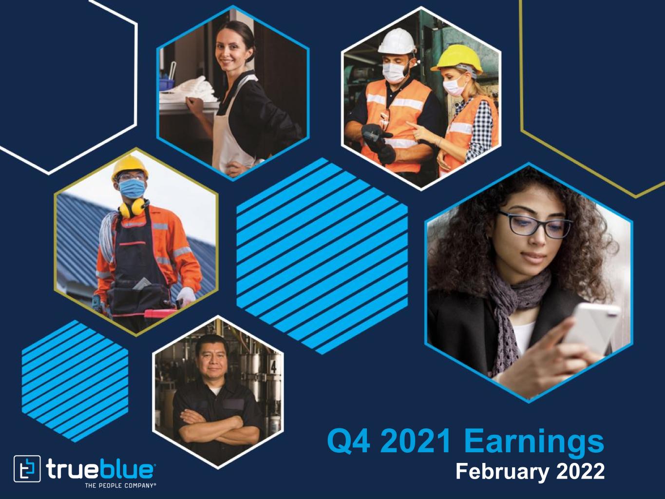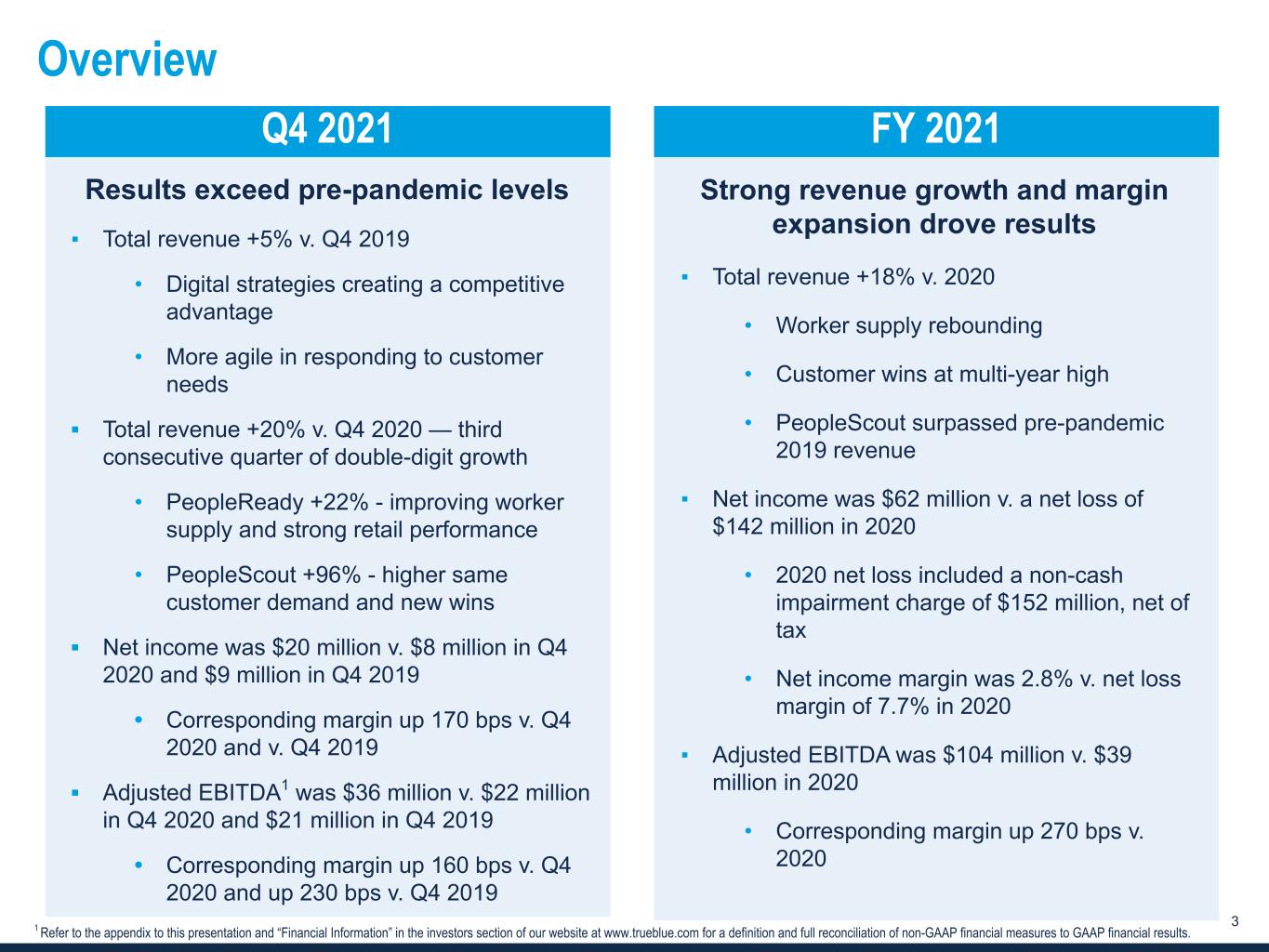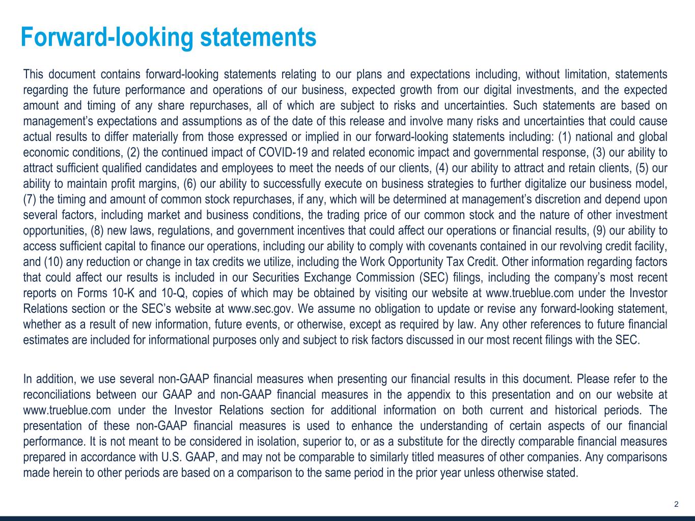 www.TrueBlue.c om 2 Forward-looking statements This document contains forward-looking statements relating to our plans and expectations including, without limitation, statements regarding the future performance and operations of our business, expected growth from our digital investments, and the expected amount and timing of any share repurchases, all of which are subject to risks and uncertainties. Such statements are based on management’s expectations and assumptions as of the date of this release and involve many risks and uncertainties that could cause actual results to differ materially from those expressed or implied in our forward-looking statements including: (1) national and global economic conditions, (2) the continued impact of COVID-19 and related economic impact and governmental response, (3) our ability to attract sufficient qualified candidates and employees to meet the needs of our clients, (4) our ability to attract and retain clients, (5) our ability to maintain profit margins, (6) our ability to successfully execute on business strategies to further digitalize our business model, (7) the timing and amount of common stock repurchases, if any, which will be determined at management’s discretion and depend upon several factors, including market and business conditions, the trading price of our common stock and the nature of other investment opportunities, (8) new laws, regulations, and government incentives that could affect our operations or financial results, (9) our ability to access sufficient capital to finance our operations, including our ability to comply with covenants contained in our revolving credit facility, and (10) any reduction or change in tax credits we utilize, including the Work Opportunity Tax Credit. Other information regarding factors that could affect our results is included in our Securities Exchange Commission (SEC) filings, including the company’s most recent reports on Forms 10-K and 10-Q, copies of which may be obtained by visiting our website at www.trueblue.com under the Investor Relations section or the SEC’s website at www.sec.gov. We assume no obligation to update or revise any forward-looking statement, whether as a result of new information, future events, or otherwise, except as required by law. Any other references to future financial estimates are included for informational purposes only and subject to risk factors discussed in our most recent filings with the SEC. In addition, we use several non-GAAP financial measures when presenting our financial results in this document. Please refer to the reconciliations between our GAAP and non-GAAP financial measures in the appendix to this presentation and on our website at www.trueblue.com under the Investor Relations section for additional information on both current and historical periods. The presentation of these non-GAAP financial measures is used to enhance the understanding of certain aspects of our financial performance. It is not meant to be considered in isolation, superior to, or as a substitute for the directly comparable financial measures prepared in accordance with U.S. GAAP, and may not be comparable to similarly titled measures of other companies. Any comparisons made herein to other periods are based on a comparison to the same period in the prior year unless otherwise stated.