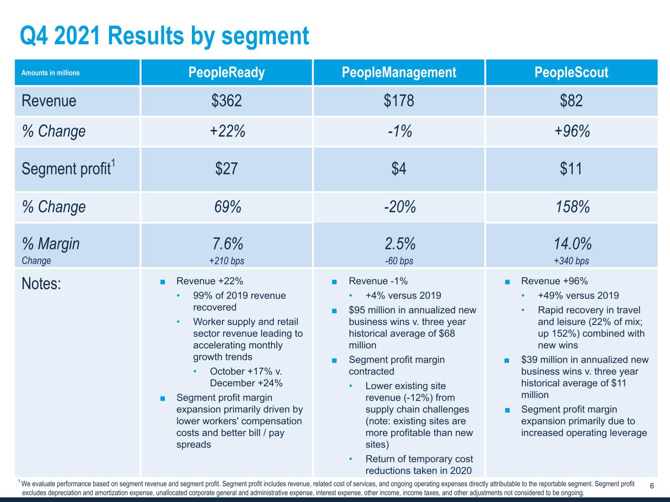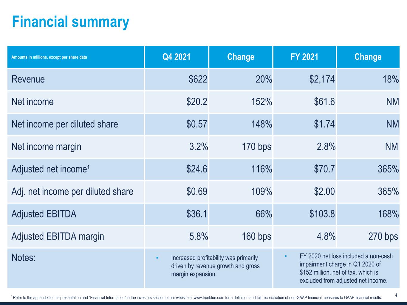 www.TrueBlue.c om 3 Overview 1 Refer to the appendix to this presentation and “Financial Information” in the investors section of our website at www.trueblue.com for a definition and full reconciliation of non-GAAP financial measures to GAAP financial results. Q4 2021 FY 2021 Results exceed pre-pandemic levels ▪ Total revenue +5% v. Q4 2019 • Digital strategies creating a competitive advantage • More agile in responding to customer needs ▪ Total revenue +20% v. Q4 2020 — third consecutive quarter of double-digit growth • PeopleReady +22% - improving worker supply and strong retail performance • PeopleScout +96% - higher same customer demand and new wins ▪ Net income was $20 million v. $8 million in Q4 2020 and $9 million in Q4 2019 • Corresponding margin up 170 bps v. Q4 2020 and v. Q4 2019 ▪ Adjusted EBITDA1 was $36 million v. $22 million in Q4 2020 and $21 million in Q4 2019 • Corresponding margin up 160 bps v. Q4 2020 and up 230 bps v. Q4 2019 Strong revenue growth and margin expansion drove results ▪ Total revenue +18% v. 2020 • Worker supply rebounding • Customer wins at multi-year high • PeopleScout surpassed pre-pandemic 2019 revenue ▪ Net income was $62 million v. a net loss of $142 million in 2020 • 2020 net loss included a non-cash impairment charge of $152 million, net of tax • Net income margin was 2.8% v. net loss margin of 7.7% in 2020 ▪ Adjusted EBITDA was $104 million v. $39 million in 2020 • Corresponding margin up 270 bps v. 2020