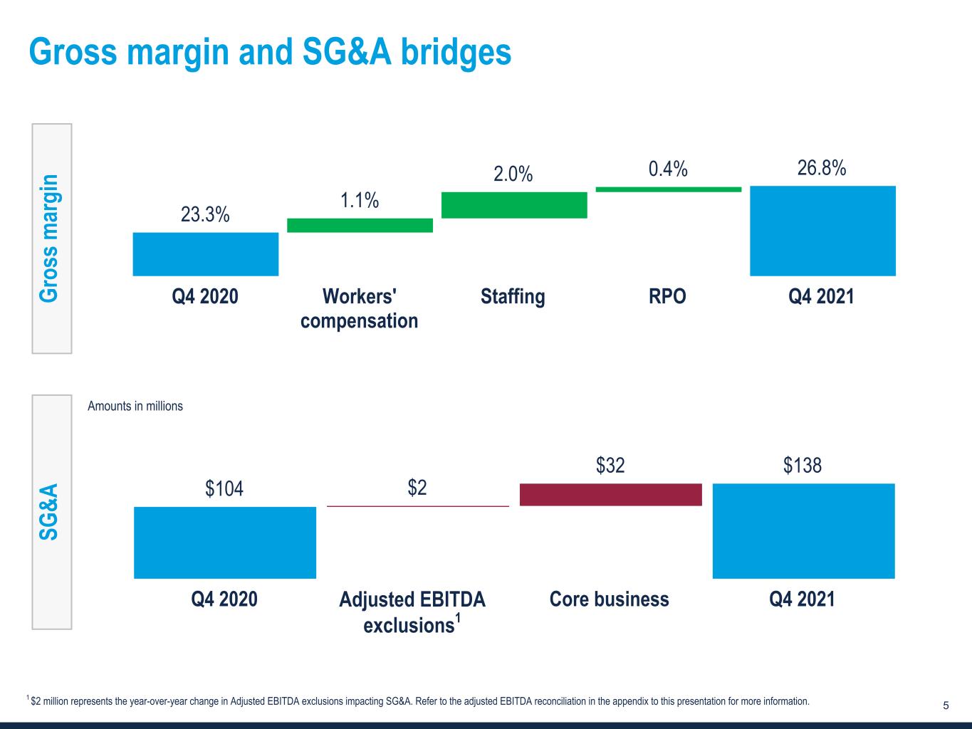 www.TrueBlue.c om 4 Financial summary 1 Refer to the appendix to this presentation and “Financial Information” in the investors section of our website at www.trueblue.com for a definition and full reconciliation of non-GAAP financial measures to GAAP financial results. Amounts in millions, except per share data Q4 2021 Change FY 2021 Change Revenue $622 20 % $2,174 18 % Net income $20.2 152 % $61.6 NM Net income per diluted share $0.57 148 % $1.74 NM Net income margin 3.2 % 170 bps 2.8 % NM Adjusted net income¹ $24.6 116 % $70.7 365 % Adj. net income per diluted share $0.69 109 % $2.00 365 % Adjusted EBITDA $36.1 66 % $103.8 168 % Adjusted EBITDA margin 5.8 % 160 bps 4.8 % 270 bps Notes: ▪ Increased profitability was primarily driven by revenue growth and gross margin expansion. ▪ FY 2020 net loss included a non-cash impairment charge in Q1 2020 of $152 million, net of tax, which is excluded from adjusted net income.