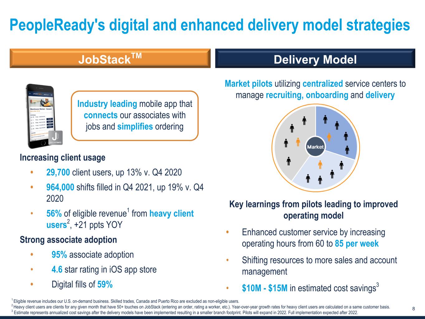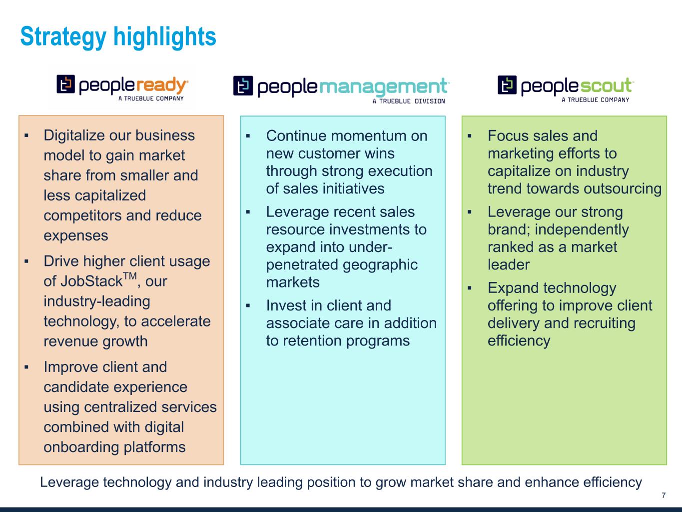 www.TrueBlue.c om 7 Strategy highlights Leverage technology and industry leading position to grow market share and enhance efficiency ▪ Focus sales and marketing efforts to capitalize on industry trend towards outsourcing ▪ Leverage our strong brand; independently ranked as a market leader ▪ Expand technology offering to improve client delivery and recruiting efficiency ▪ Digitalize our business model to gain market share from smaller and less capitalized competitors and reduce expenses ▪ Drive higher client usage of JobStackTM, our industry-leading technology, to accelerate revenue growth ▪ Improve client and candidate experience using centralized services combined with digital onboarding platforms ▪ Continue momentum on new customer wins through strong execution of sales initiatives ▪ Leverage recent sales resource investments to expand into under- penetrated geographic markets ▪ Invest in client and associate care in addition to retention programs