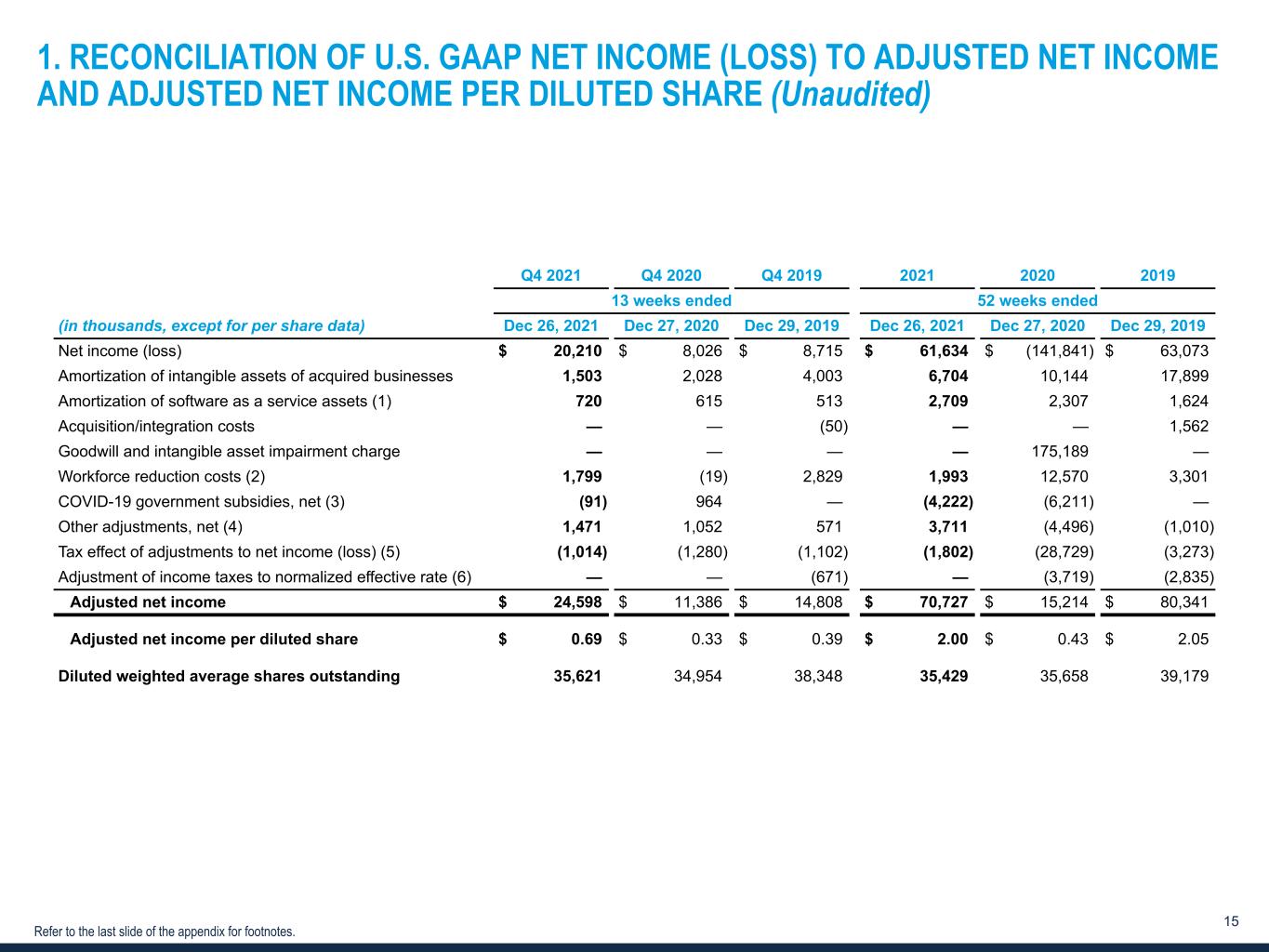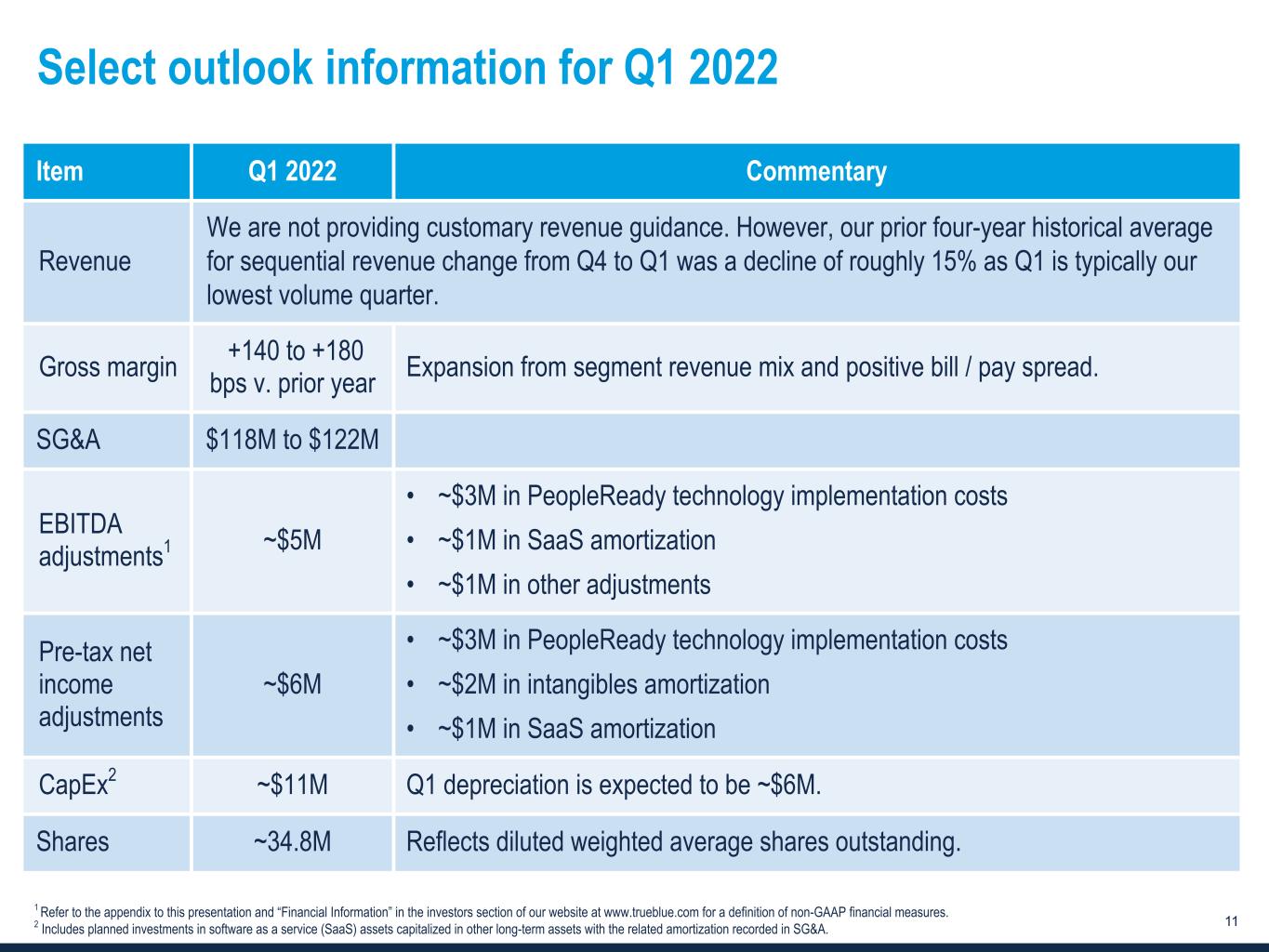 www.TrueBlue.c om 17 Footnotes: (1) Amortization of software as a service assets is reported in selling, general and administrative expense. (2) Workforce reduction costs for the 13 and 52 weeks ended December 26, 2021 in selling, general and administrative expense primarily include costs to streamline our delivery teams within our PeopleReady and PeopleScout segments. Workforce reduction costs for the 13 and 52 weeks ended December 27, 2020 were primarily due to employee reductions as part of our cost management actions in response to COVID-19 ($3.7 million in cost of services and $8.9 million in selling, general and administrative expense for the full-year). Workforce reduction costs for the 13 and 52 weeks ended December 29, 2019 were primarily associated with employee reductions in the PeopleReady business. (3) Net impact of COVID-19 related government subsidies. For the 13 and 52 weeks ended December 27, 2020, we received government subsidies of $2.7 million and $9.9 million, respectively. We elected to distribute a portion of the total benefit for the year to our employees in the form of a $3.7 million bonus, resulting in a net cost of $1.0 million for Q4 and a net benefit of $6.2 million for the fiscal year. These subsidies extended into 2021, providing a benefit of $4.2 million for the 52 weeks ended December 26, 2021. (4) Other adjustments for the 13 and 52 weeks ended December 26, 2021 primarily include implementation costs for cloud-based systems of $1.4 million and $1.7 million, respectively and costs incurred while transitioning into our new Chicago office of $0.1 million and $1.8 million, respectively. Other adjustments for the 13 and 52 weeks ended December 27, 2020 primarily include costs of $0.7 million incurred while transitioning into our new Chicago office and implementation costs for cloud-based systems of $0.1 million and $0.9 million, respectively. For the 52 weeks ended December 27, 2020, these expenses were offset by a $6.3 million benefit from a reduction in expected costs to comply with the Affordable Care Act. Other adjustments for the 13 and 52 weeks ended December 29, 2019 primarily include implementation costs for cloud-based systems of $0.6 million and $3.2 million, respectively. For the 52 weeks ended December 29, 2019, these expenses were offset by $3.9 million of workers’ compensation benefit related to additional insurance coverage associated with former workers’ compensation carriers in liquidation. (5) Total tax effect of each of the adjustments to U.S. GAAP net income (loss) using the effective income tax rate for the respective periods in 2021 and 2020, and the expected long-term ongoing rate of 14 percent for Q4 and fiscal year 2019. (6) Beginning in Q2 2020, we decided not to adjust our GAAP tax rate to an expected long-term ongoing rate in our adjusted net income calculation. Thus the adjustment for fiscal year 2020 relates to the Q1 2020 adjustment of the effective income tax rate to the long-term ongoing rate of 12 percent expected at that time. The adjustment for Q4 and fiscal year 2019 reflects the adjustment of the effective income tax rate to the long-term ongoing rate of 14 percent expected at that time. (7) These third-party processing fees are associated with generating hiring tax credits. (8) Gain realized on sale of deferred compensation mutual funds to purchase corporate owned life insurance policies.