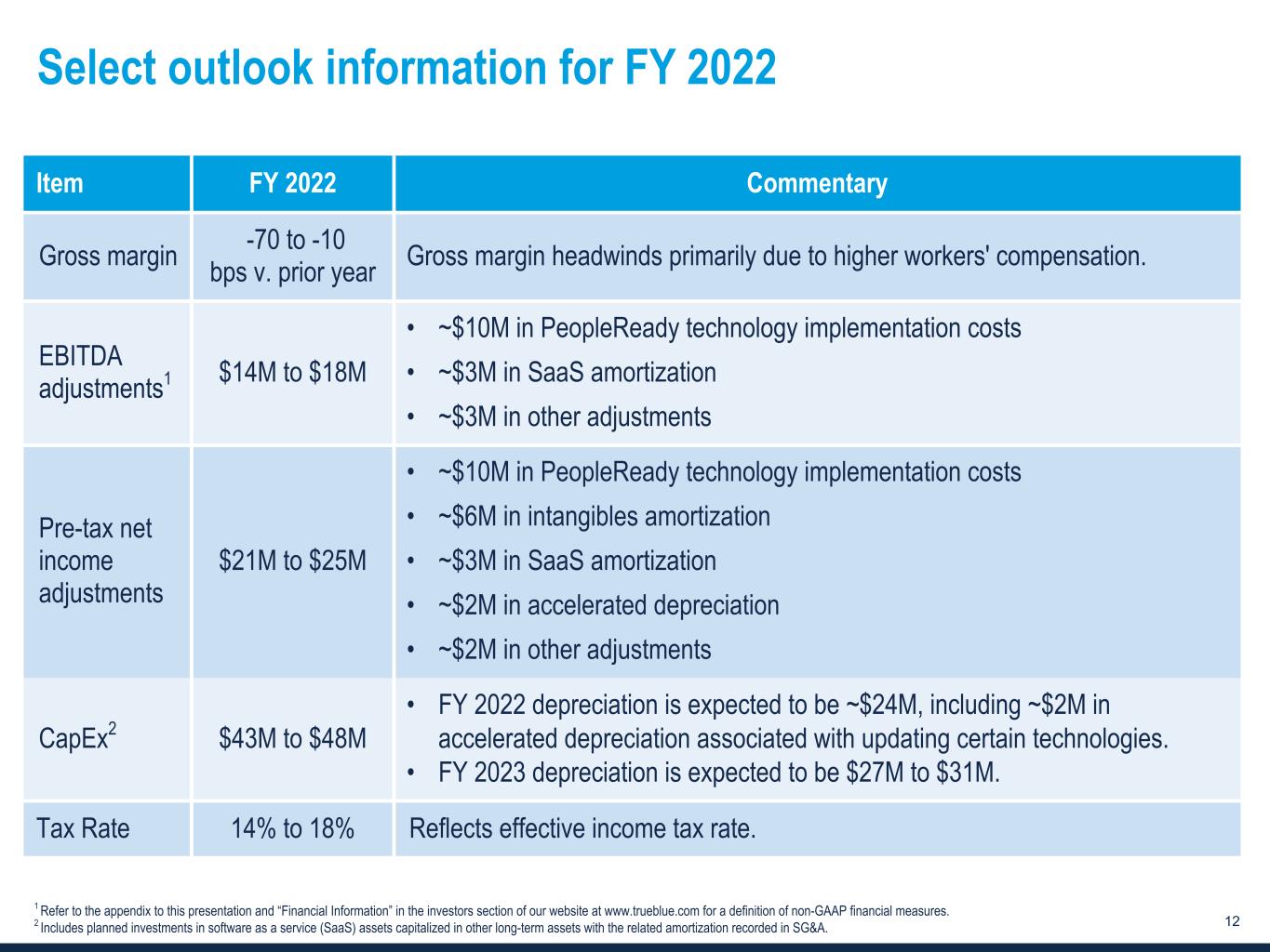 www.TrueBlue.c om 11 Select outlook information for Q1 2022 Item Q1 2022 Commentary Revenue We are not providing customary revenue guidance. However, our prior four-year historical average for sequential revenue change from Q4 to Q1 was a decline of roughly 15% as Q1 is typically our lowest volume quarter. Gross margin +140 to +180 bps v. prior year Expansion from segment revenue mix and positive bill / pay spread. SG&A $118M to $122M EBITDA adjustments1 ~$5M • ~$3M in PeopleReady technology implementation costs • ~$1M in SaaS amortization • ~$1M in other adjustments Pre-tax net income adjustments ~$6M • ~$3M in PeopleReady technology implementation costs • ~$2M in intangibles amortization • ~$1M in SaaS amortization CapEx2 ~$11M Q1 depreciation is expected to be ~$6M. Shares ~34.8M Reflects diluted weighted average shares outstanding. 1 Refer to the appendix to this presentation and “Financial Information” in the investors section of our website at www.trueblue.com for a definition of non-GAAP financial measures. 2 Includes planned investments in software as a service (SaaS) assets capitalized in other long-term assets with the related amortization recorded in SG&A.