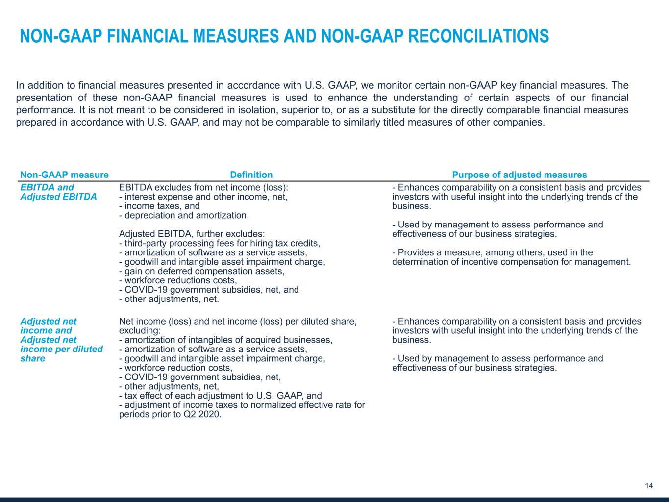 www.TrueBlue.c om 14 NON-GAAP FINANCIAL MEASURES AND NON-GAAP RECONCILIATIONS In addition to financial measures presented in accordance with U.S. GAAP, we monitor certain non-GAAP key financial measures. The presentation of these non-GAAP financial measures is used to enhance the understanding of certain aspects of our financial performance. It is not meant to be considered in isolation, superior to, or as a substitute for the directly comparable financial measures prepared in accordance with U.S. GAAP, and may not be comparable to similarly titled measures of other companies. Non-GAAP measure Definition Purpose of adjusted measures EBITDA and Adjusted EBITDA EBITDA excludes from net income (loss): - interest expense and other income, net, - income taxes, and - depreciation and amortization. Adjusted EBITDA, further excludes: - third-party processing fees for hiring tax credits, - amortization of software as a service assets, - goodwill and intangible asset impairment charge, - gain on deferred compensation assets, - workforce reductions costs, - COVID-19 government subsidies, net, and - other adjustments, net. - Enhances comparability on a consistent basis and provides investors with useful insight into the underlying trends of the business. - Used by management to assess performance and effectiveness of our business strategies. - Provides a measure, among others, used in the determination of incentive compensation for management. Adjusted net income and Adjusted net income per diluted share Net income (loss) and net income (loss) per diluted share, excluding: - amortization of intangibles of acquired businesses, - amortization of software as a service assets, - goodwill and intangible asset impairment charge, - workforce reduction costs, - COVID-19 government subsidies, net, - other adjustments, net, - tax effect of each adjustment to U.S. GAAP, and - adjustment of income taxes to normalized effective rate for periods prior to Q2 2020. - Enhances comparability on a consistent basis and provides investors with useful insight into the underlying trends of the business. - Used by management to assess performance and effectiveness of our business strategies.